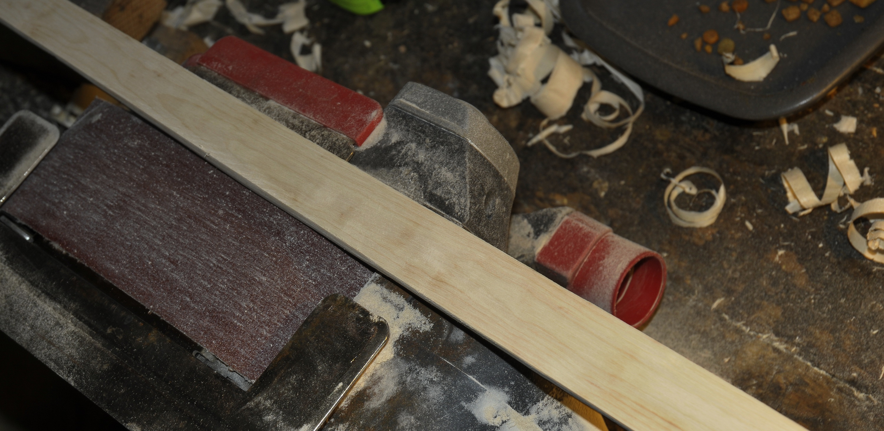 Das Hasellaminat ist schon fast trocken, ich hab es mit Raspel, Hobel und am Schluss mit dem Bandschleifer auf ca. 1 cm Dicke am Griff und 0,7 mm am Ende getapert.