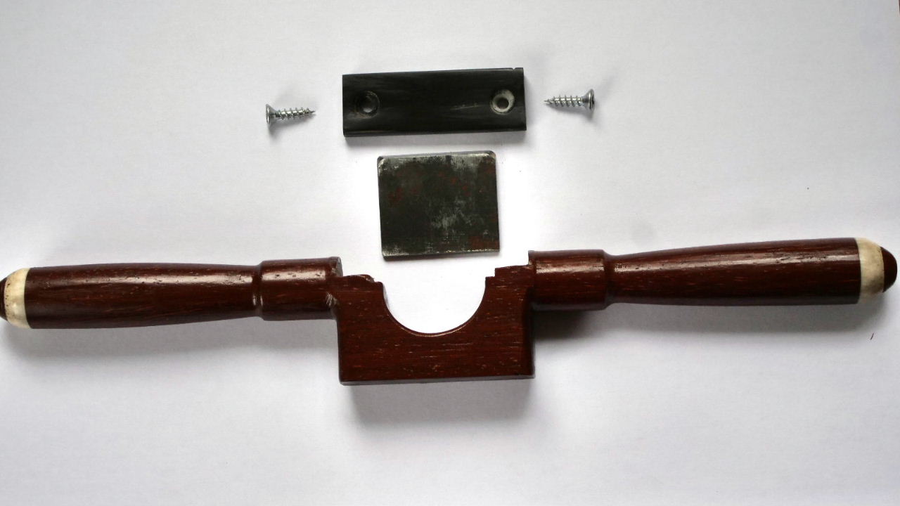 Die Andruckplatte wurde aus einem Stück Wasserbüffelhorn hergestellt, einfach wegen der besseren Haltbarkeit. Einfache Holzschrauben reichen für den Andruck aus. Die Einzelteile des Hobels zeigt Abb. 4.