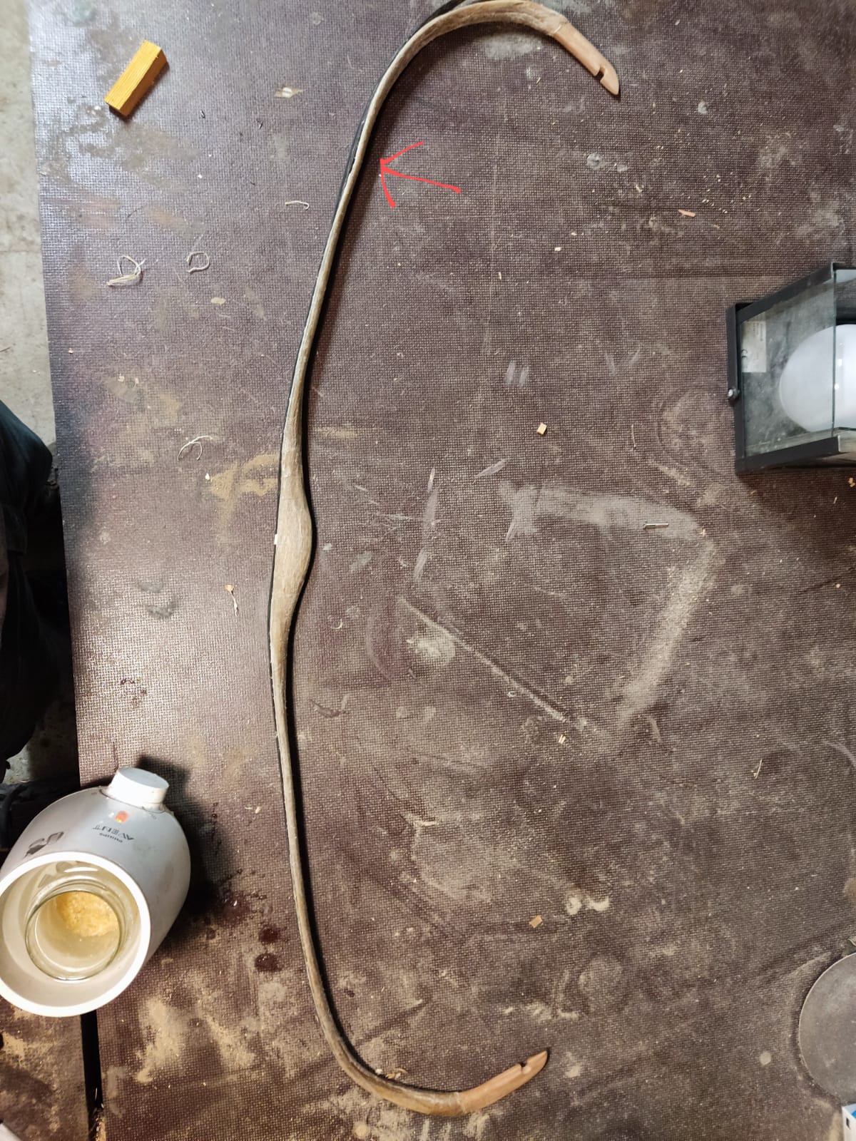 Bei dem roten Pfeil ist der Bruch Unter Biegung kann man erahnen, wo der Bruch ist. Es ist sehr schwierig das ganze vernünftig zu fotografieren, da nur in der Mitte des Bogenrückens eine kleine Beule ist. Vermutlich also nur ein Span der sich unter den Sehnen aufgerichtet hat.