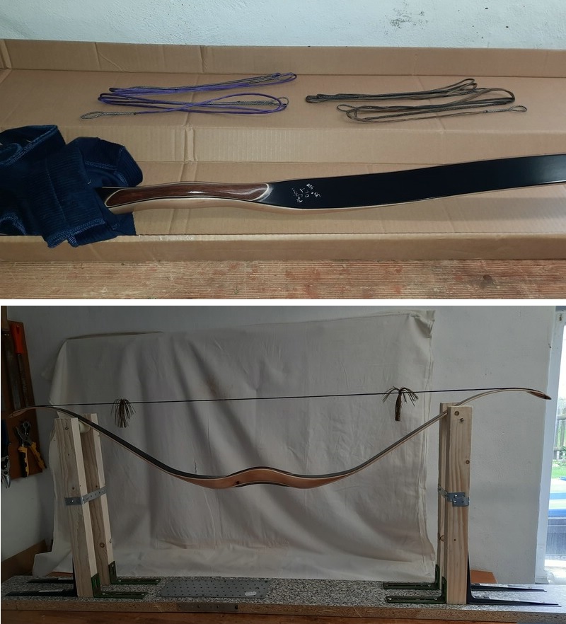Bespannt wird der Bogen mit einer schnellen Fast-Flight-Sehne, wahlweise mit einer Hybridsehne. Er hat mir von jeder Sorte 2 Stck. mitgegeben.