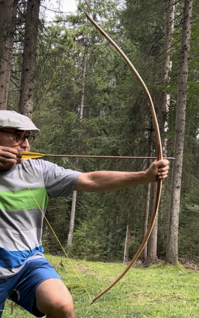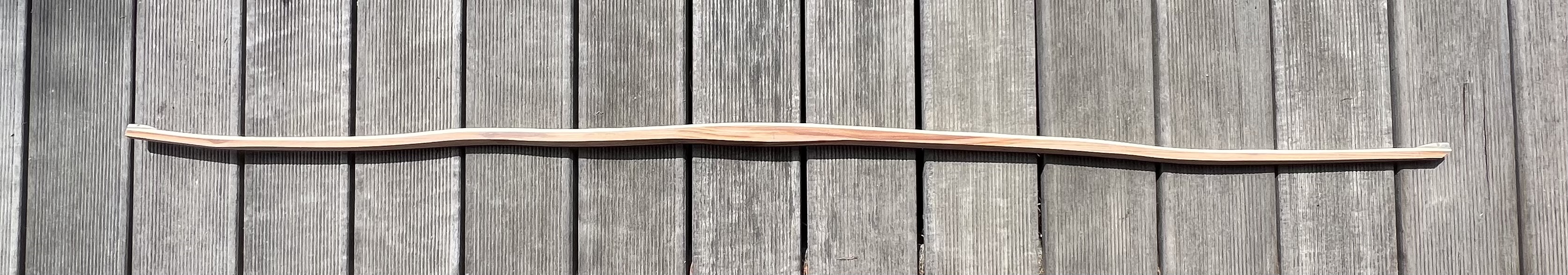 Ich möchte heute meinen neuen Zwetschkenbogen zeigen. Lange war ich mir sicher, dass „der nix wird“. Aber schlussendlich wollte er doch ein Bogen werden. Ausgangsmaterial war ein Stammabschnitt eines alten Zwetschkenbaums, verdreht, verworfen, Weißfäule und ein Gangsystem im Splint und Kern von immer noch lebenden Mitbewohnern. Irgendwie habe ich ein einigermaßen brauchbares Stück herausschneiden und schleifen können. Wellig mit deflexen und reflexen Abschnitten, der gesamte Reflex betrug 15cm, am Bauch waren aber viele Schadstellen und so beschloss ich den Bogen umzudrehen, jetzt 15cm Deflex! Die Stellen mit Weißfäule wurden ausgekratzt und mit Epoxy gefüllt. Dann habe ich einen Hasel geerntet und ein Laminat herausgeschnitten und schnellgetrocknet. Das Anformen an das Zwetschkenlaminat war wegen der Schlangenform nicht einfach. Beim Verkleben der Laminate habe ich den Bogen auf einem Brett flach gedrückt (versteckter Perry Reflex).