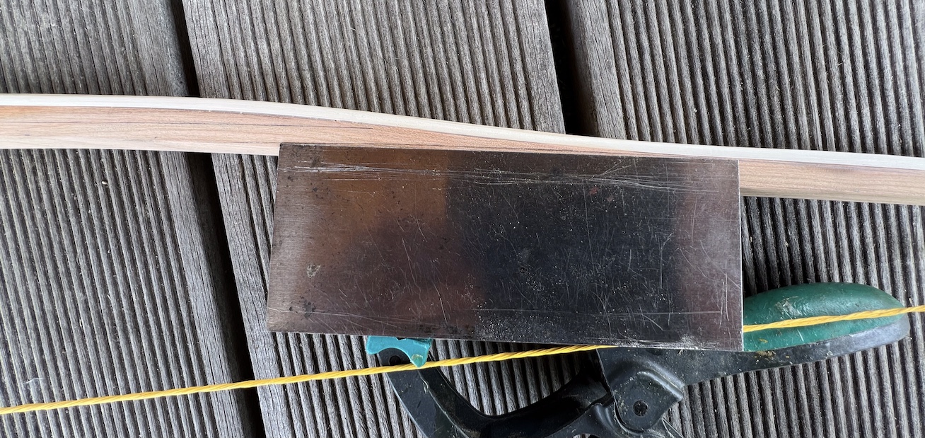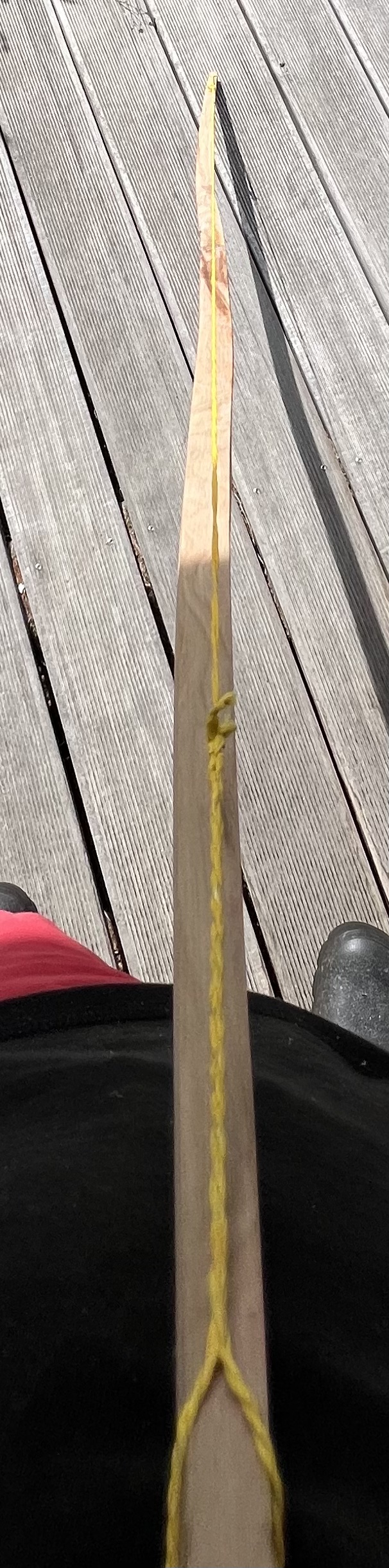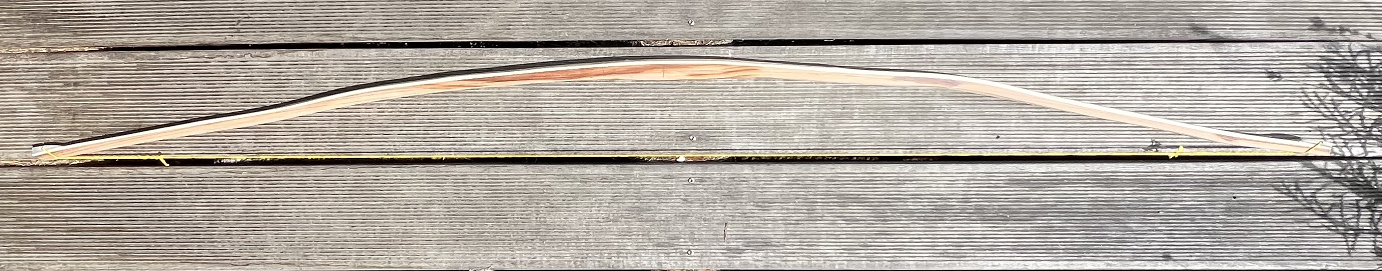 Den Bogen habe ich dann nach Gefühl getapert, eine Tillerlinie aufgezeichnet und einfach aufgespannt. Überraschenderweise bog sich der Bogen ganz gleichmäßig und die Wurfarme waren von Anfang an in der Balance.