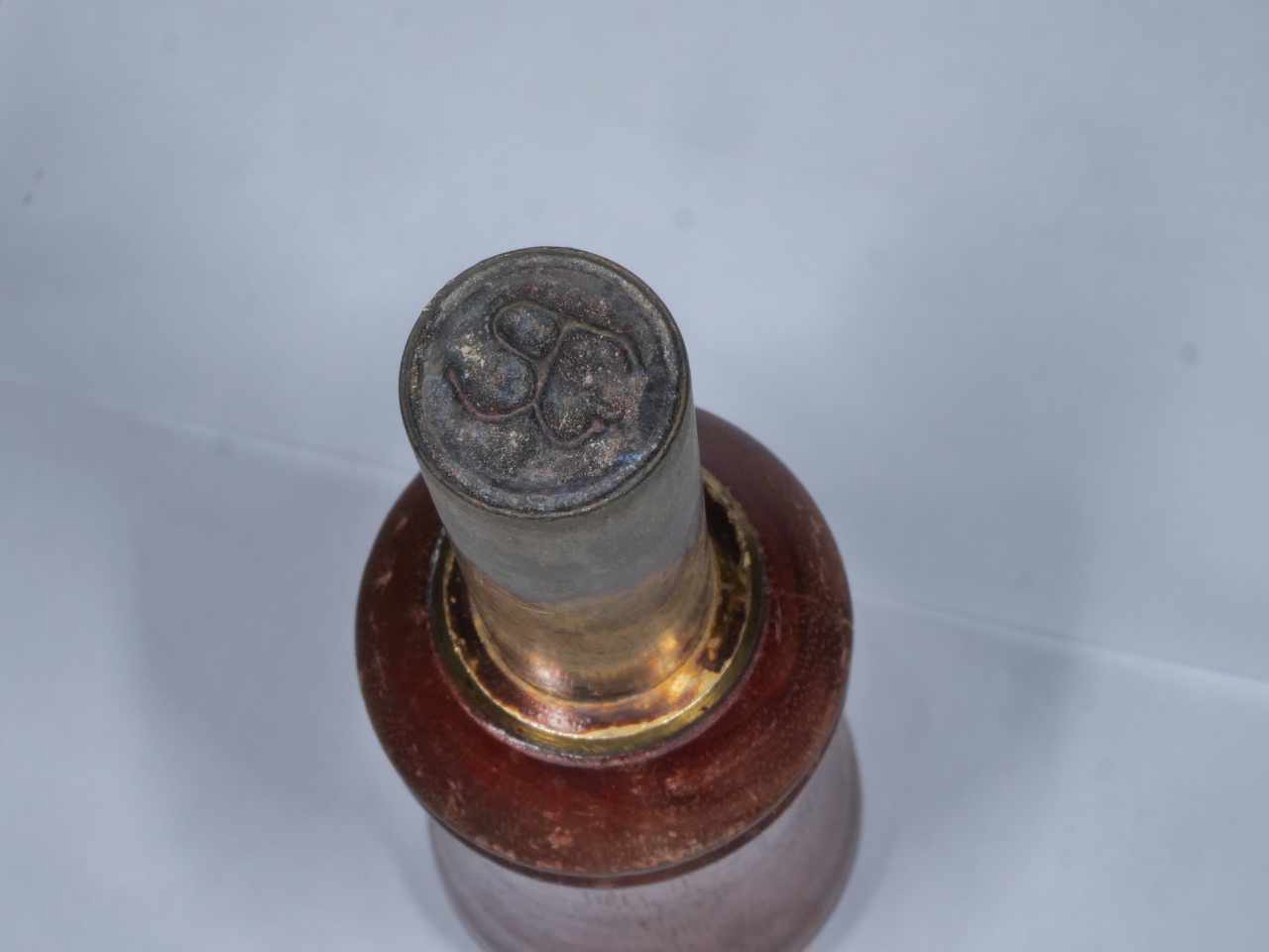 Rechts eingebrannte Signatur, links eingeschlagen mit Gummihammer und Stempelfarbe.