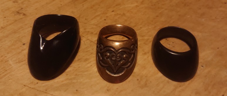 Zwei Lederdäumlinge habe ich ganz schnell zur Seite gelegt; mit einen Kunststoff-Daumenring hatte ich etwas länger Geduld - bevor ich mir vor einem knappen Jahr einen Messing-Daumenring zugelegt habe und mit diesem recht zufrieden und glücklich bin