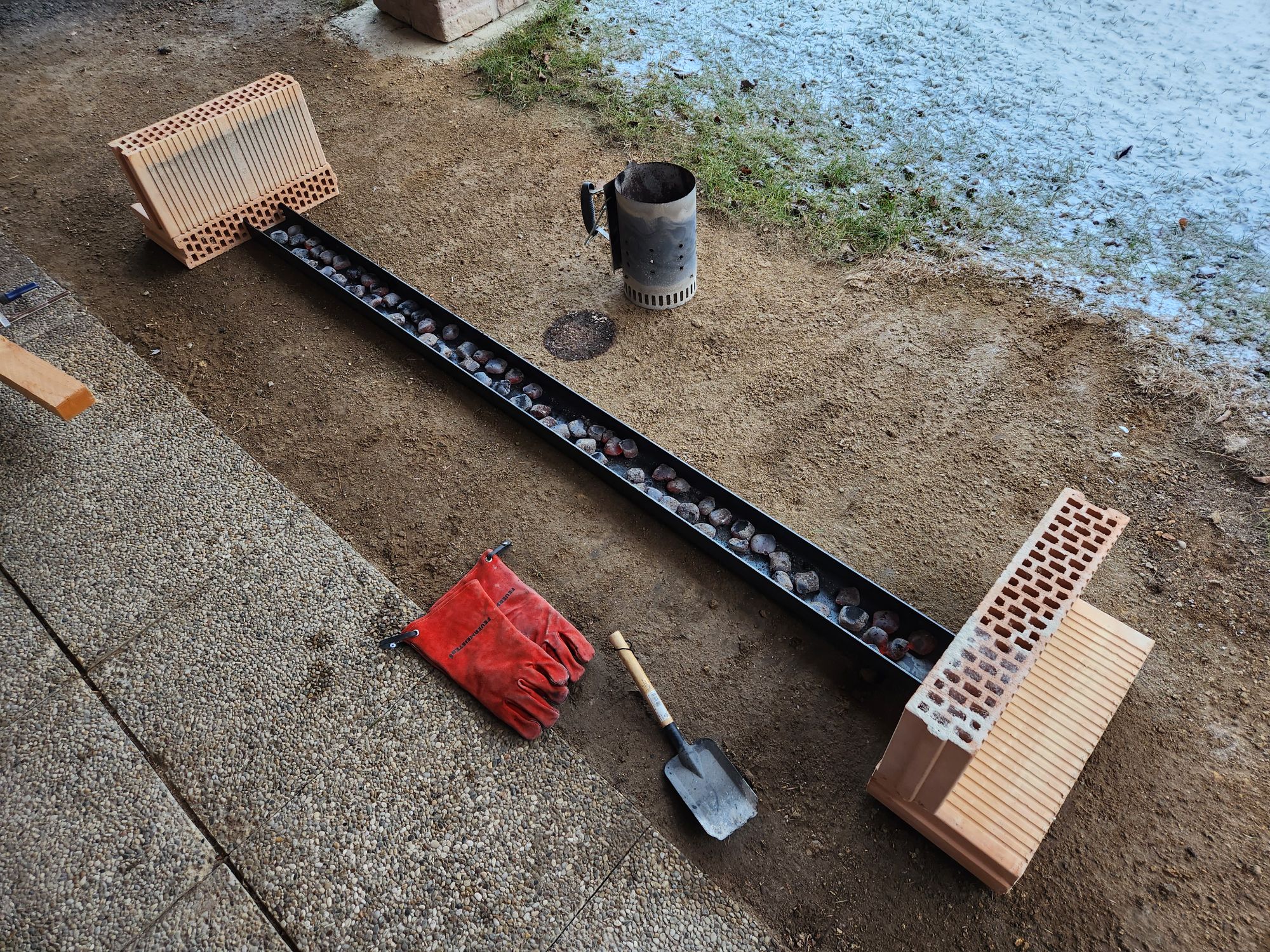 Ich hab die verkohlten Stellen gelöscht und dachte mir dass die Kohlen ja sowieso schnell an stärke nachlassen, und hab nur die Kohlen von den Enden und dem Griffbereich weggeschoben. Dann waren dadurch aber an ner anderen Stelle der Vorrichtung zu viele Kohlen und diese Glut hat dann auf den Bogen übergegriffen...