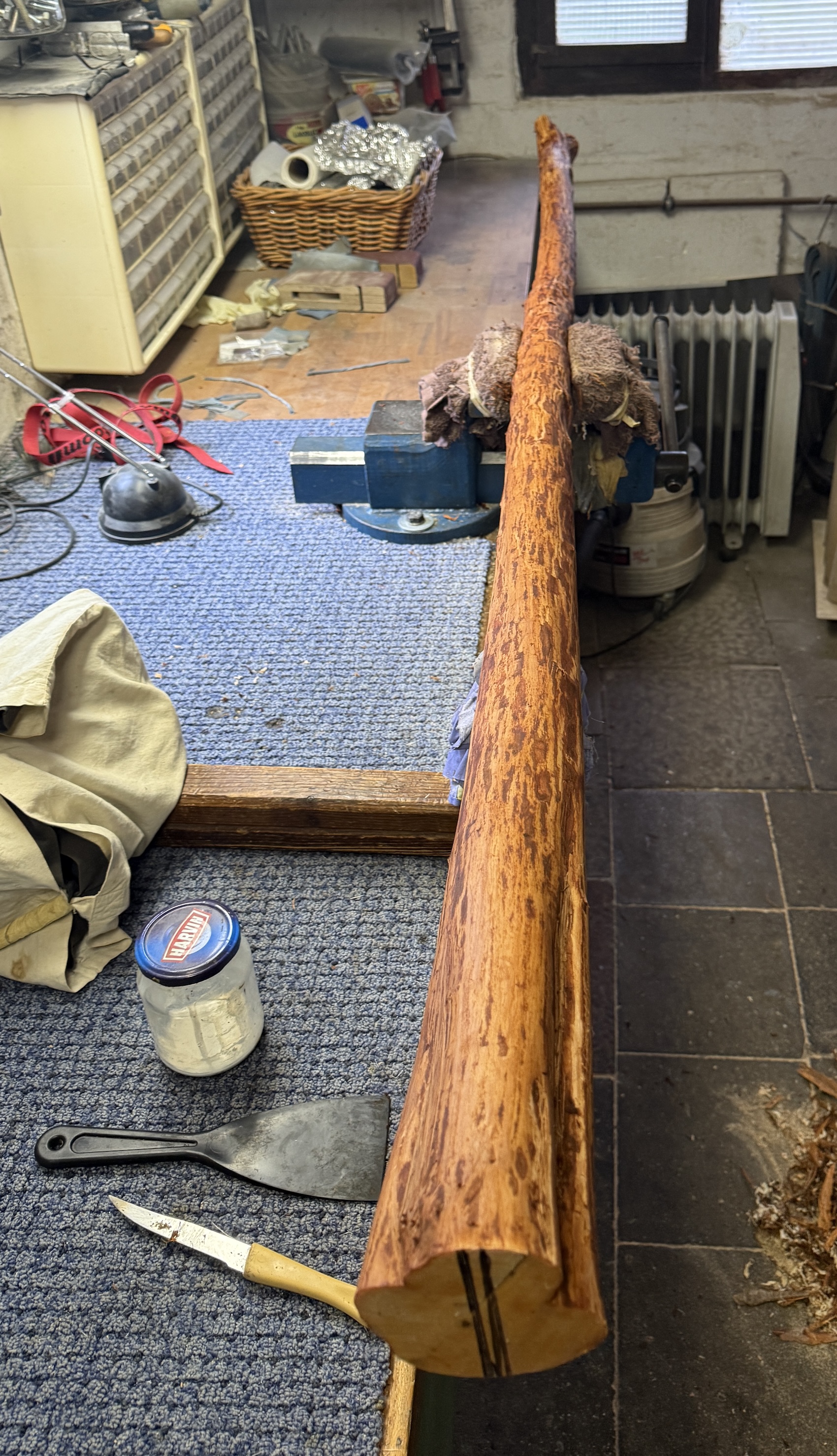 Gestern abend und heute früh habe ich die Rinde runter geporkelt und mit verdünntem Holzleim eingerieben. Die Länge ist im Moment 203cm, aber oben ist ja noch die Astgabel, da wird noch was wegfallen. Durchmesser unten 95mm, DM oben vor der Astgabel 57mm, Gewicht knapp 9kg.