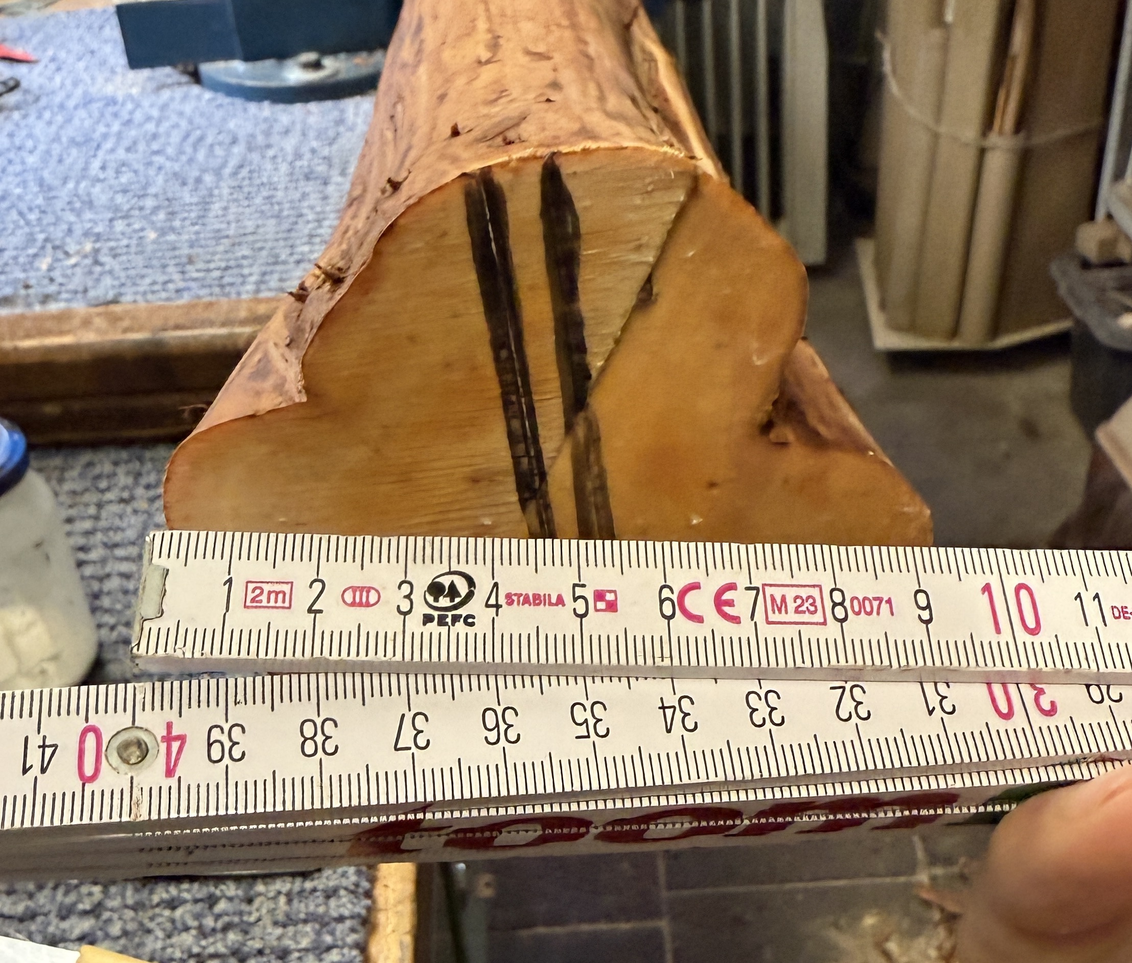 Ich habe angefangen bis zum Markkanal runterzuarbeiten und habe schon mal 3kg abgetragen. Dabei hat sich an den Enden wenigstens ein Hauch Kernholz gezeigt. Immerhin.