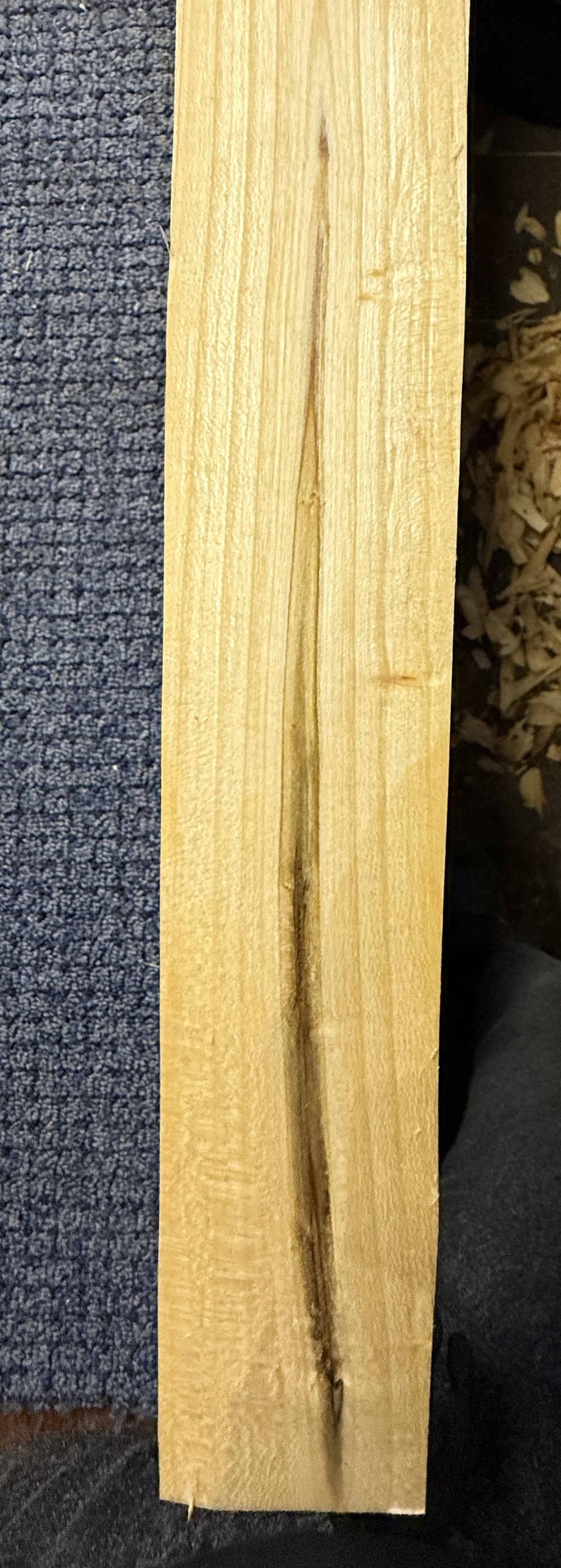 Nachtrag: Die Stelle hat mir keine Ruhe gelassen. Also habe ich mit dem Ziehmesser um einen halben Zentimeter in der Dicke reduziert und bin jetzt sicher, dass das kein Problem wird. Ich bin jetzt auf 3800g runter. Damit ist die Pflaume immer noch 4 Mal so schwer wie der geplante Bogen.