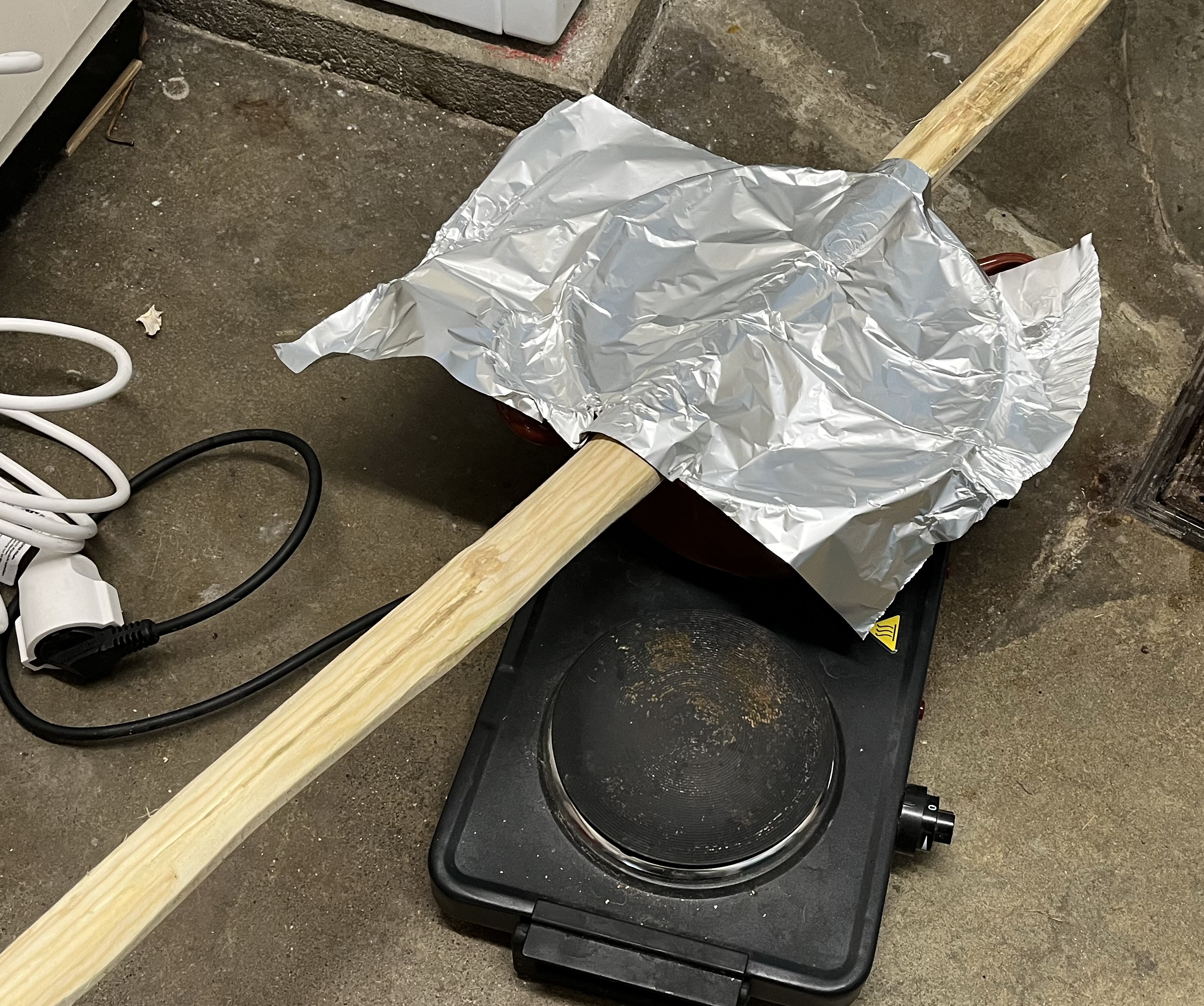 Beim Holler habe ich den anderen WA mit Wasserdampf erhitzt und etwas reflex gebogen. Momentane Länge 135 cm, der Stave ist leider etwas snaky und auch leicht verdreht, wird schwierig die Sehnenlage hinzubekommen. Einen W-Keil will ich nicht mehr versuchen, das hat nie geklappt