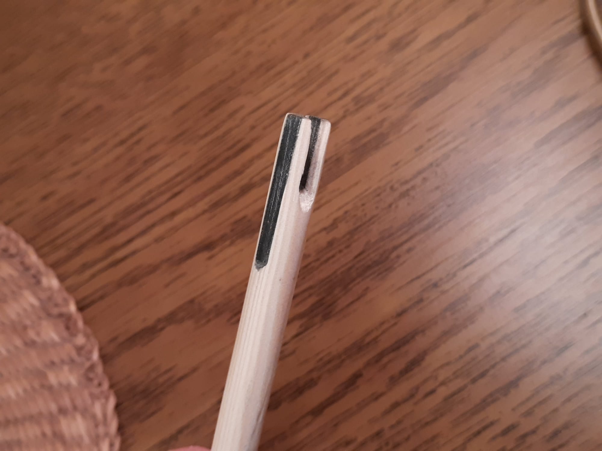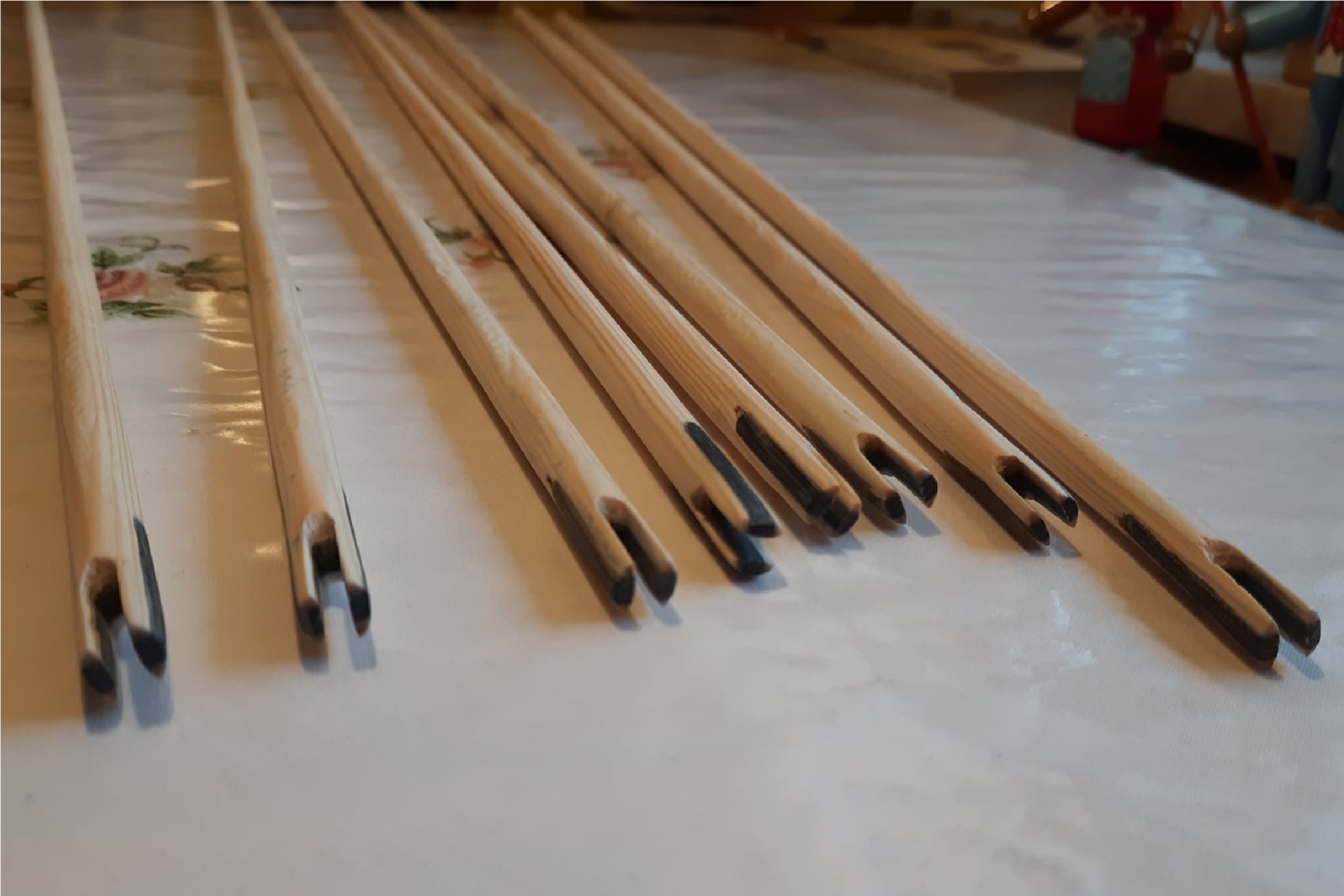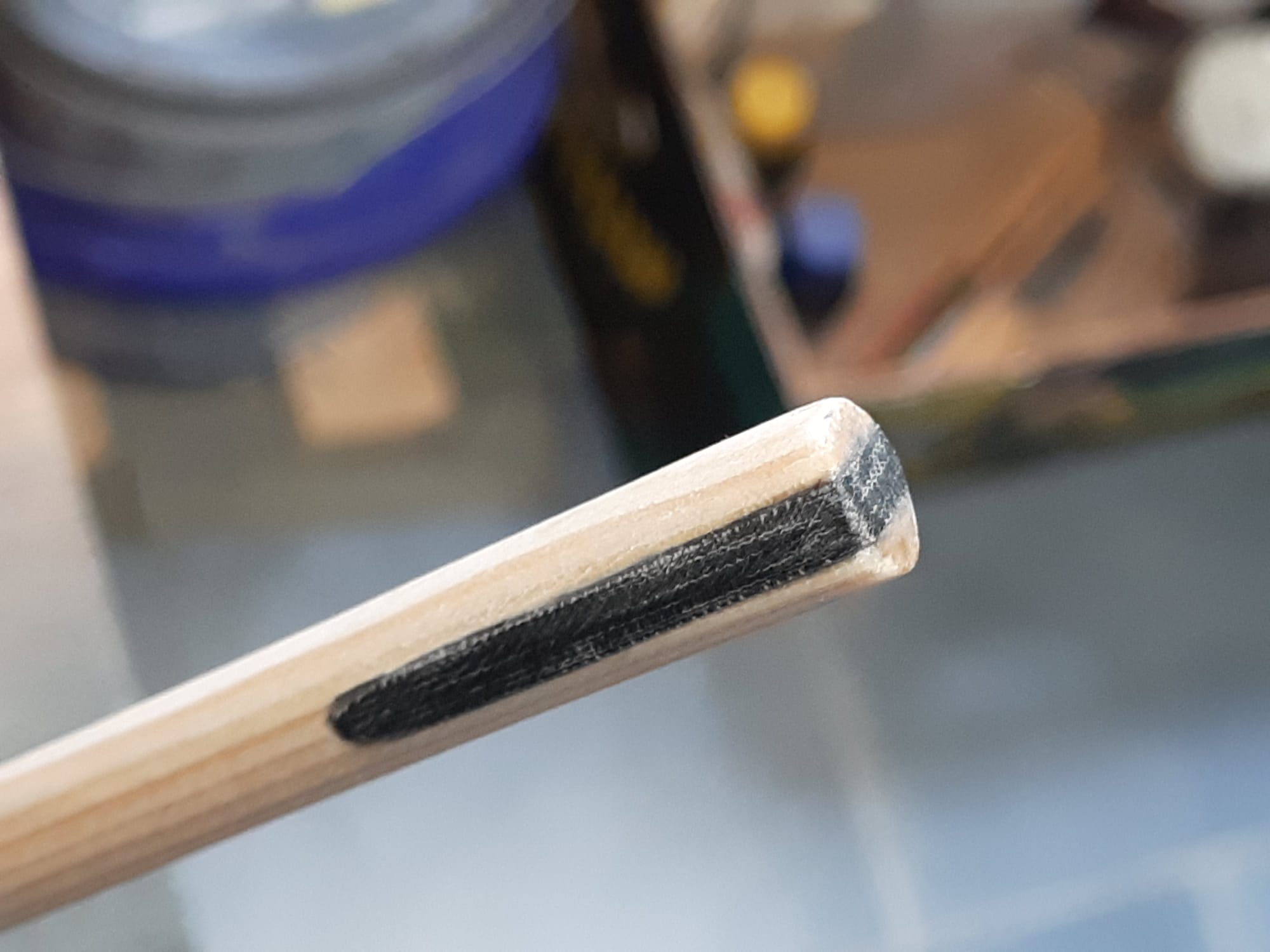 Als nächstes habe ich die Einlässe für die Micarta-Strips in die Schäfte gesägt (Selfnock-Tool nehmen). Richtung der Holzmaserung zum Inlay beachten (Laut meiner Kenntnis sollte das Inlay parallel zur Maserung liegen, damit die spätere Pfeilnocke quer zur Maserung eingeschnitten werden kann)