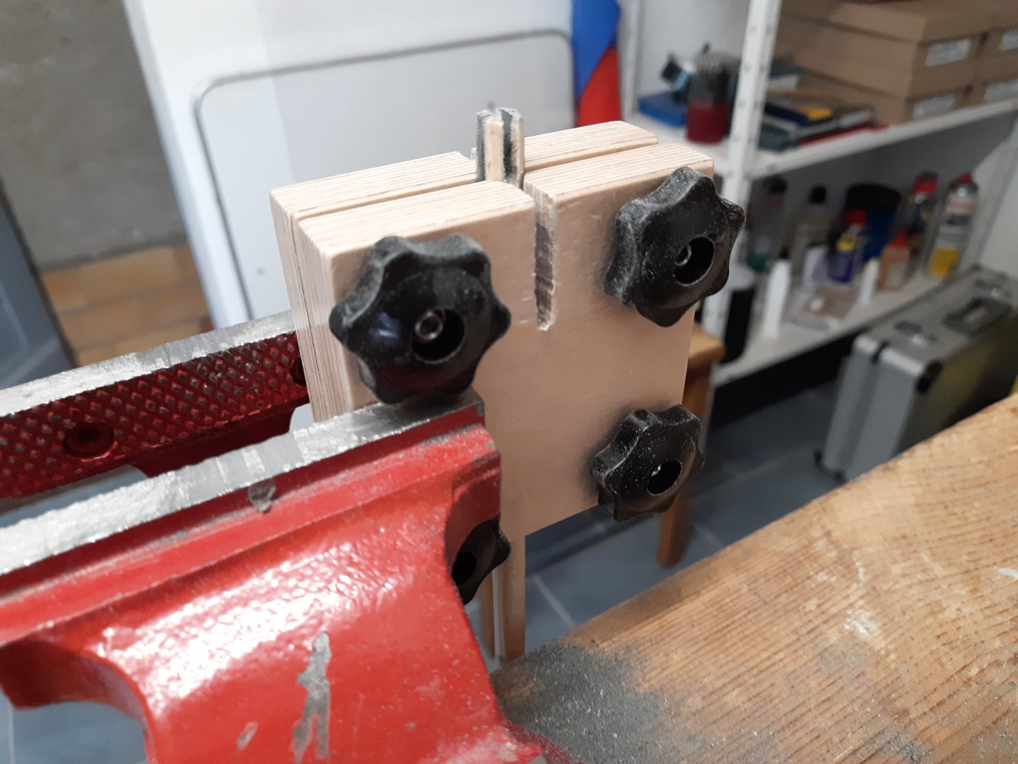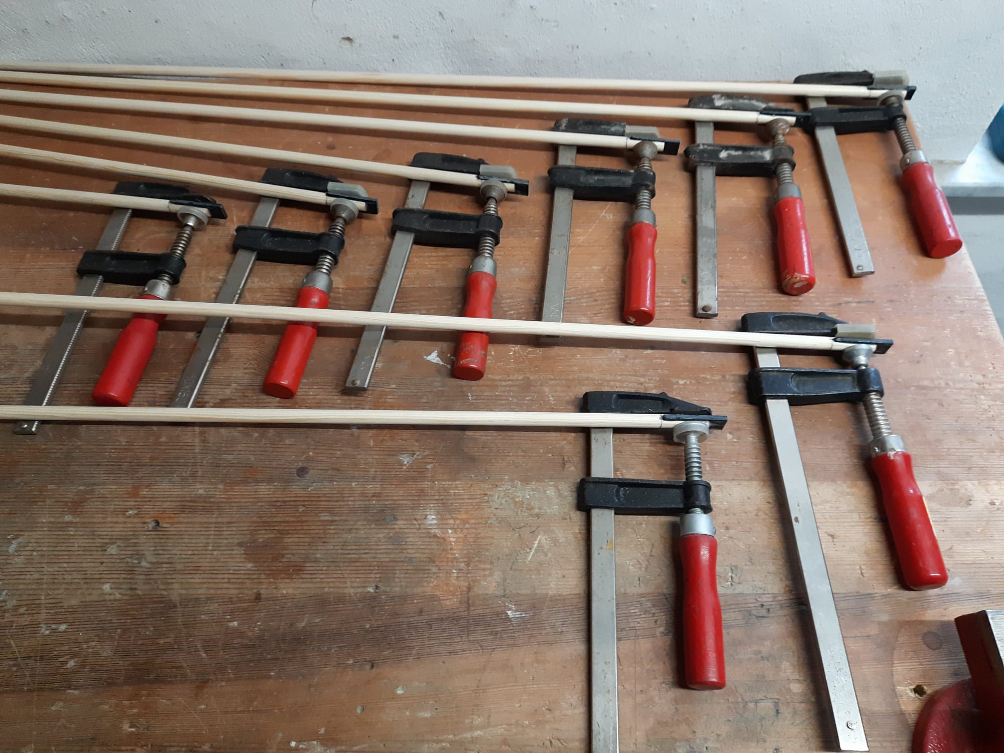 Als nächstes habe ich die Micarta-Strips mit Zweikomponentenkleber eingeklebt, mit Schraubzwingen fixiert und 24 Std. ruhen lassen