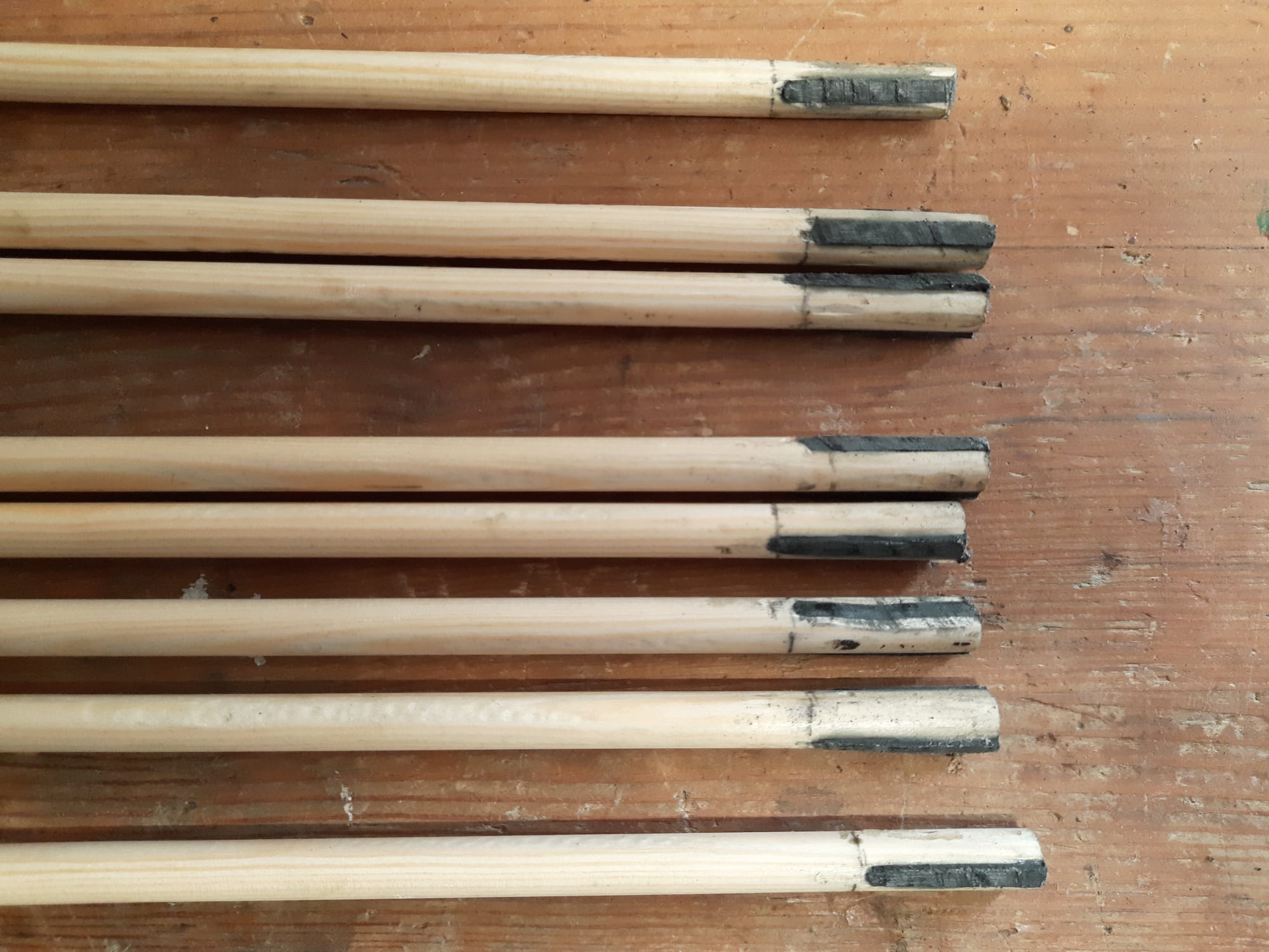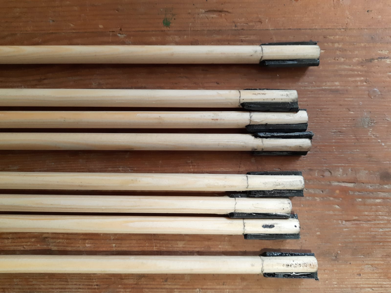 Jetzt sind die Schäfte für den Weiterbau - und zwar Pfeile mit Mittelalterspitzen. Eine Komplettwicklung um Federn und bis hin zur Nocke werde ich dem Pfeil trotz Inlay dennoch verpassen.