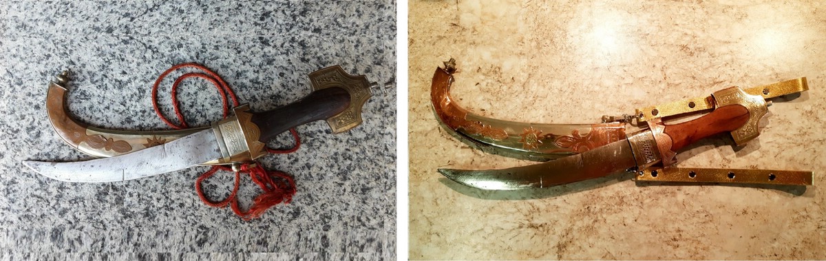 bei ebay habe ich für 53,00 € (Artikel + Versand) einen arabischen, antiken Krummdolch aus dem Jemen oder Oman erstanden. Er hat(te) deutliche Gebrauchsspuren, war aber nicht defekt. Ich habe ihn mir ein wenig "aufgehübscht", Feinheiten folgen noch. Das rote und sich auflösende Kordel-Umhängeband habe ich ersetzt durch zwei Ledergürtelschlaufen. Das Leder ist außen und passend zu den Messingbeschlägen golden.