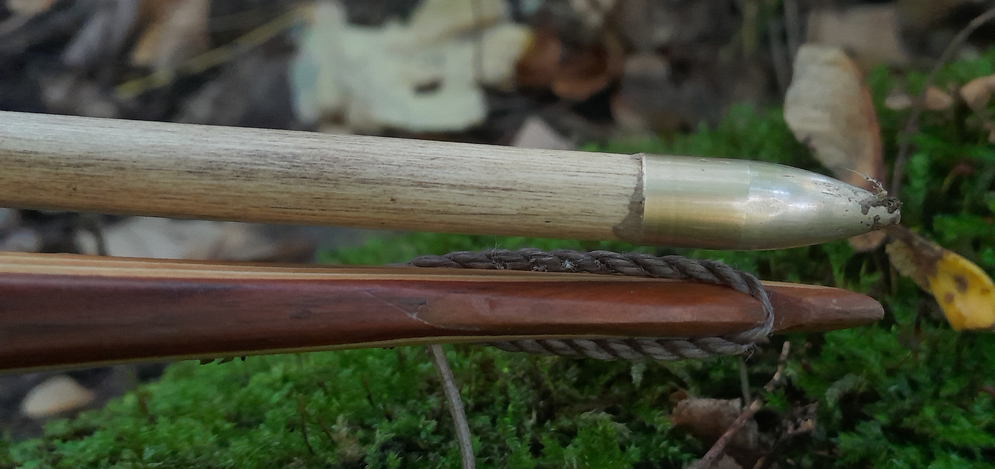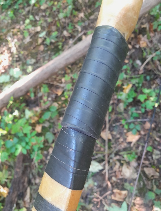 Da ein TD viel Extraarbeit macht und die Jahresringe nicht die dicksten sind, wurde ein Angstbacking aufgebracht, Rohhaut aus Hundekauknochen mit D3-Holzleim geklebt. Dann wurde ich übermütig: durch die aus Angst etwas dick gehaltenen Hülsen war der Griff recht breit. Um das zu kompensieren wollte ich den Bereich, in dem der Pfeil anliegt, etwas schmaler gestalten. Dabei war ich wohl etwas gierig, auf jeden Fall knackte es irgendwann. Das reparierte ich etwas halbherzig mit Holzleistchen und einer Manschette aus Rohhaut. Nicht besonders hübsch, aber es hielt und die Rohhaut ist ein gutes Material als Pfeilanlage.