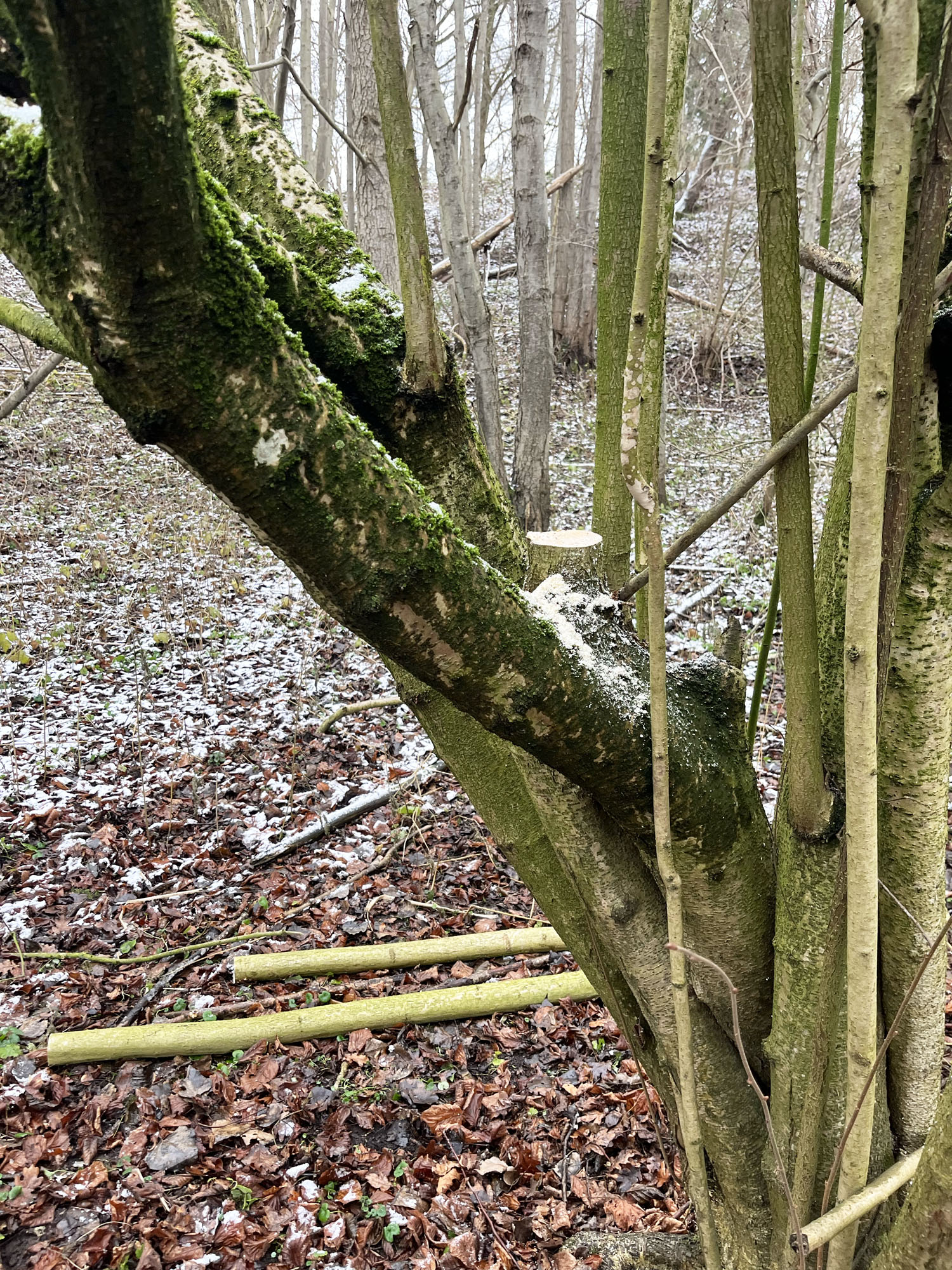 Die Haselsuche gestaltet sich einfacher und war beim ersten Versuch von Erfolg gekrönt. Ein schönes Stück, aus dem ich auf der einen Seite gerne ein Backign schneiden und den Rest zum Einsteigerbogen machen möchte.
