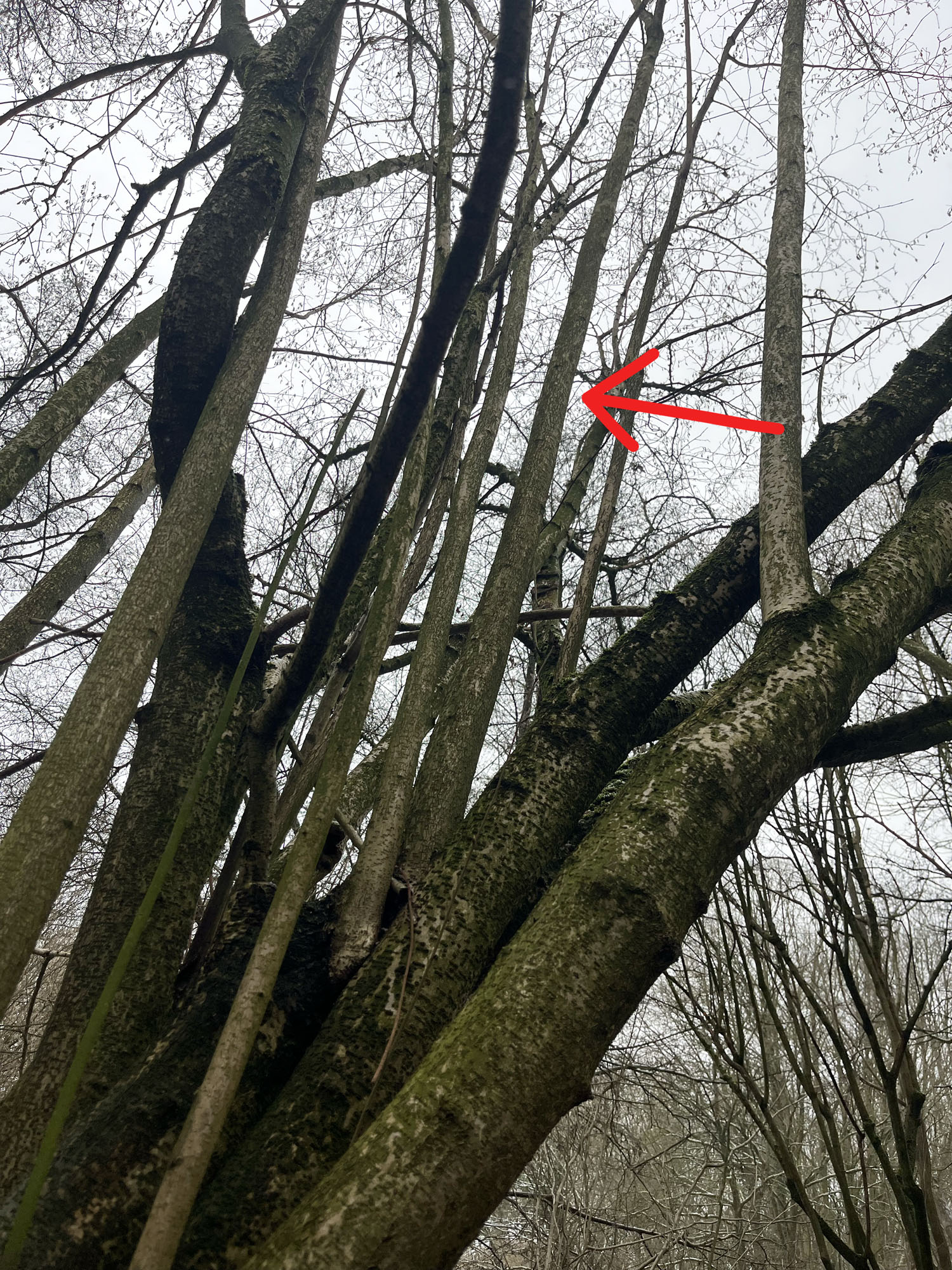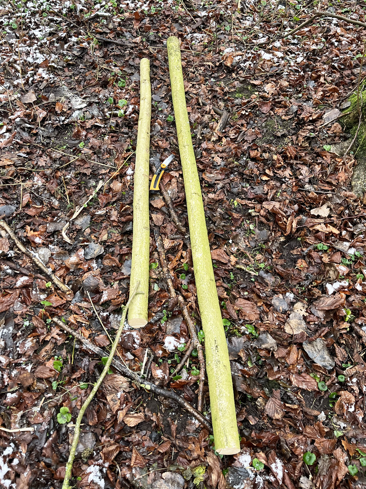 Der ist noch gut 2 Meter! Das Bild aus dem Wald schmeichelt dem guten Stück wahrscheinlich, so schön grade und astfrei ist er leider nicht. Ein großer Ast liegt etwas zu weit außerhalb der Mitte, das Ding ist untenrum ganz schön oval, mal sehen was sich noch offenbart. Ich zieh später mal die Pelle ab, dann wird das Bild klarer.