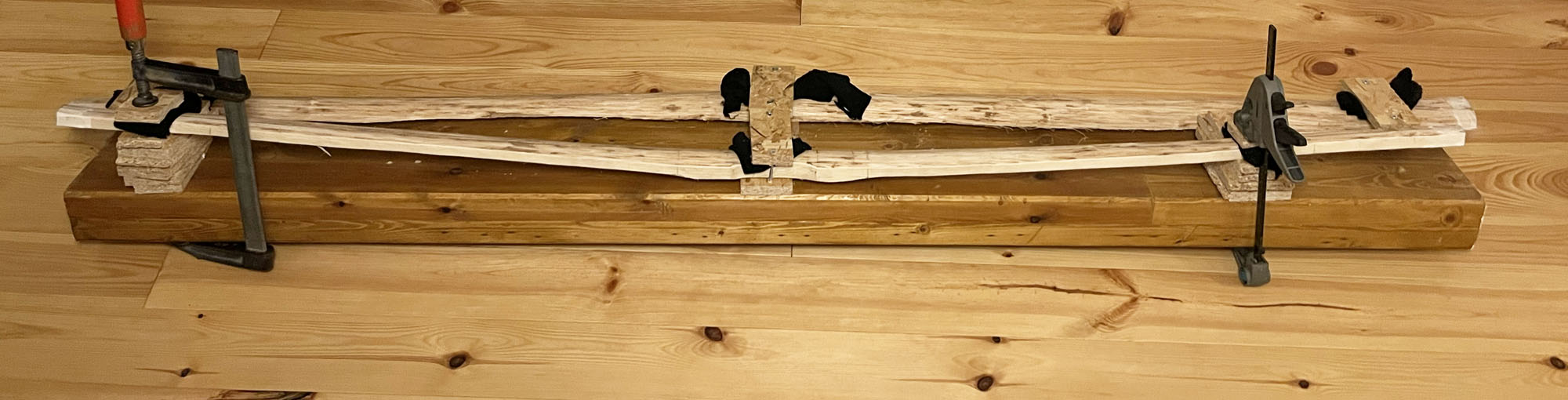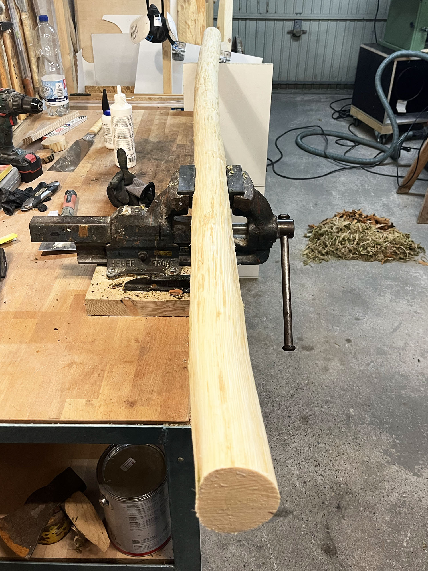 Der Hasel macht wie erwartet keine Probleme, hat eine grobe Bogenform und ist zum Trocknen festgespaxt. Draußen schien mir zu kalt, deswegen liegt er in einem (fast) unbeheizten Raum.