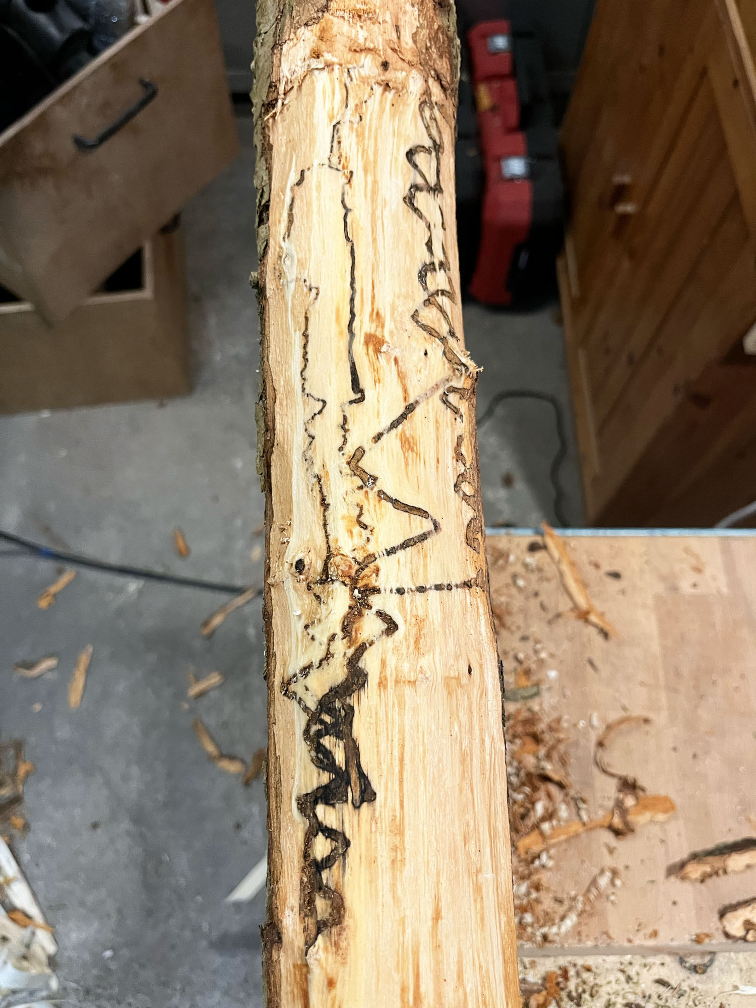 Unter dem Bast ist eine helle Schicht, die schon holzartige Konsistenz hat und durch die sich die Fraßspuren ziehen. Ist das das Kambium? Der Ring darunter ist unbeschädigt. Ich habe einen Wurfarm freigekratzt, kann aber nicht beurteilen ob der Rückenring jetzt verletzt ist, da lässt sich nichts erkennen. In der Makroaufnahme fällt es mir auch schwer die Jahresringe auseinanderzuhalten, ich schleife später noch ein besseres Stück, grade ist mir die Werkstatt noch zu kalt