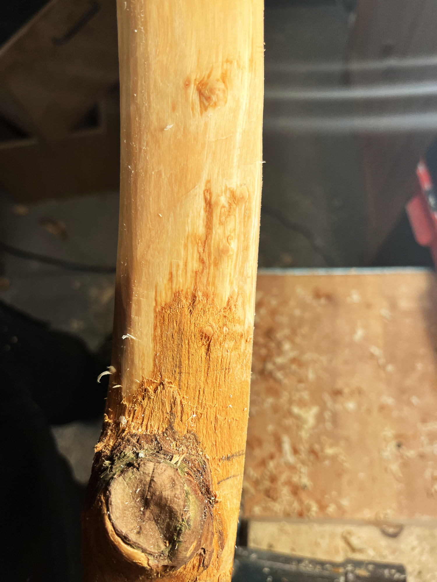 Der dicke Ast hätte irgendwie in den Griff gepasst... Jetzt sind aber auf beiden Seiten davon Fraßspuren im Holz aufgetaucht und ich sehe keinen Weg dem irgendwie auszuweichen. Ich tendiere zum Zweitdorn, über ein Backing könnte man natürlich auch noch nachdenken.