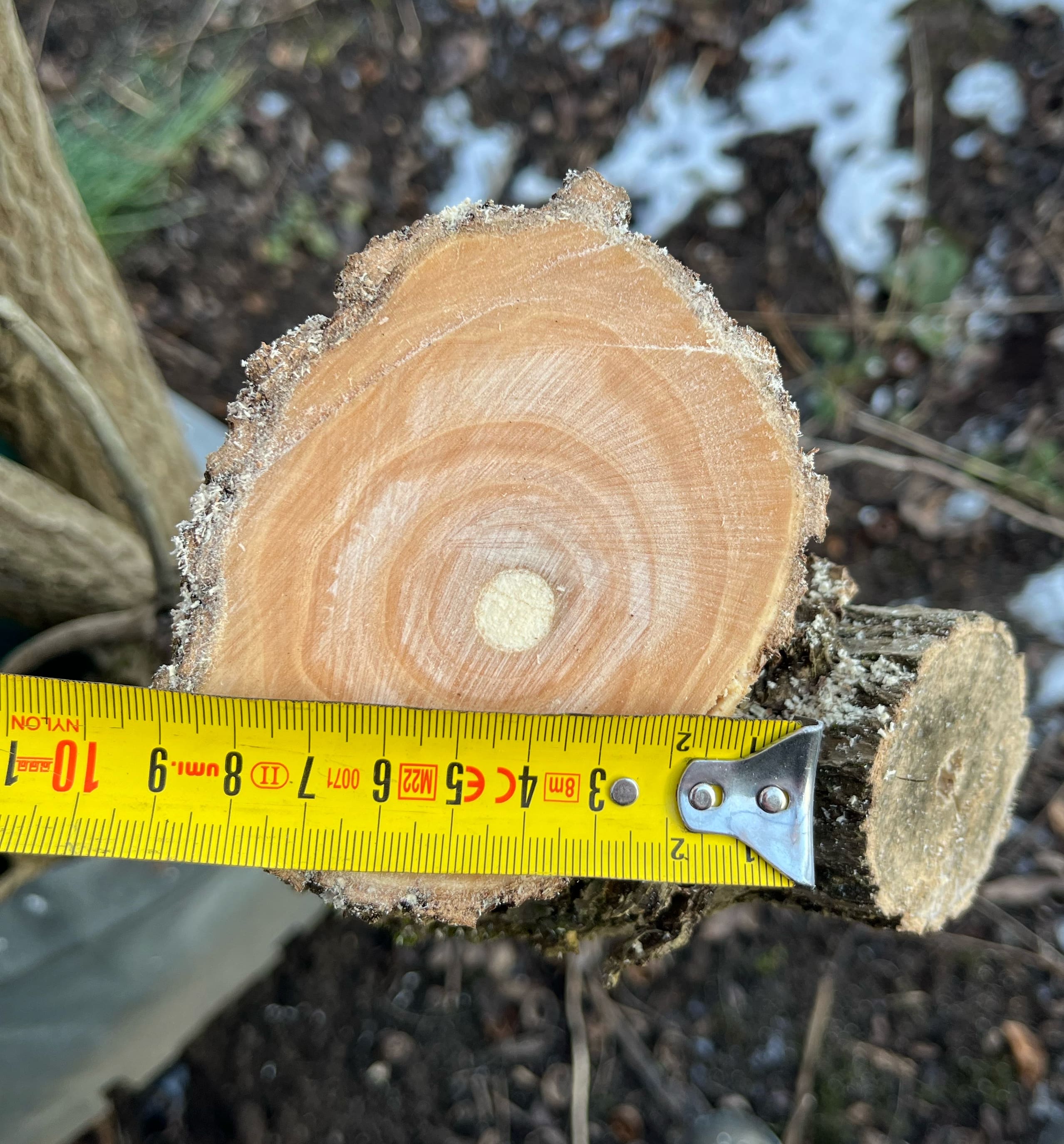 Die äußeren drei Ringe sind mies dünn, aber das ist Hasel, denk ich mir. Wär der Erste, der mir übern Rücken bricht. Ich bin ja sowieso Verfechter der Theorie, dass bei druckschwachen und zugstarken Hölzern dünne Rückenringe besser sind, also rede ich mir mal ein, das ist super so, um Knitteritis zu vermeiden