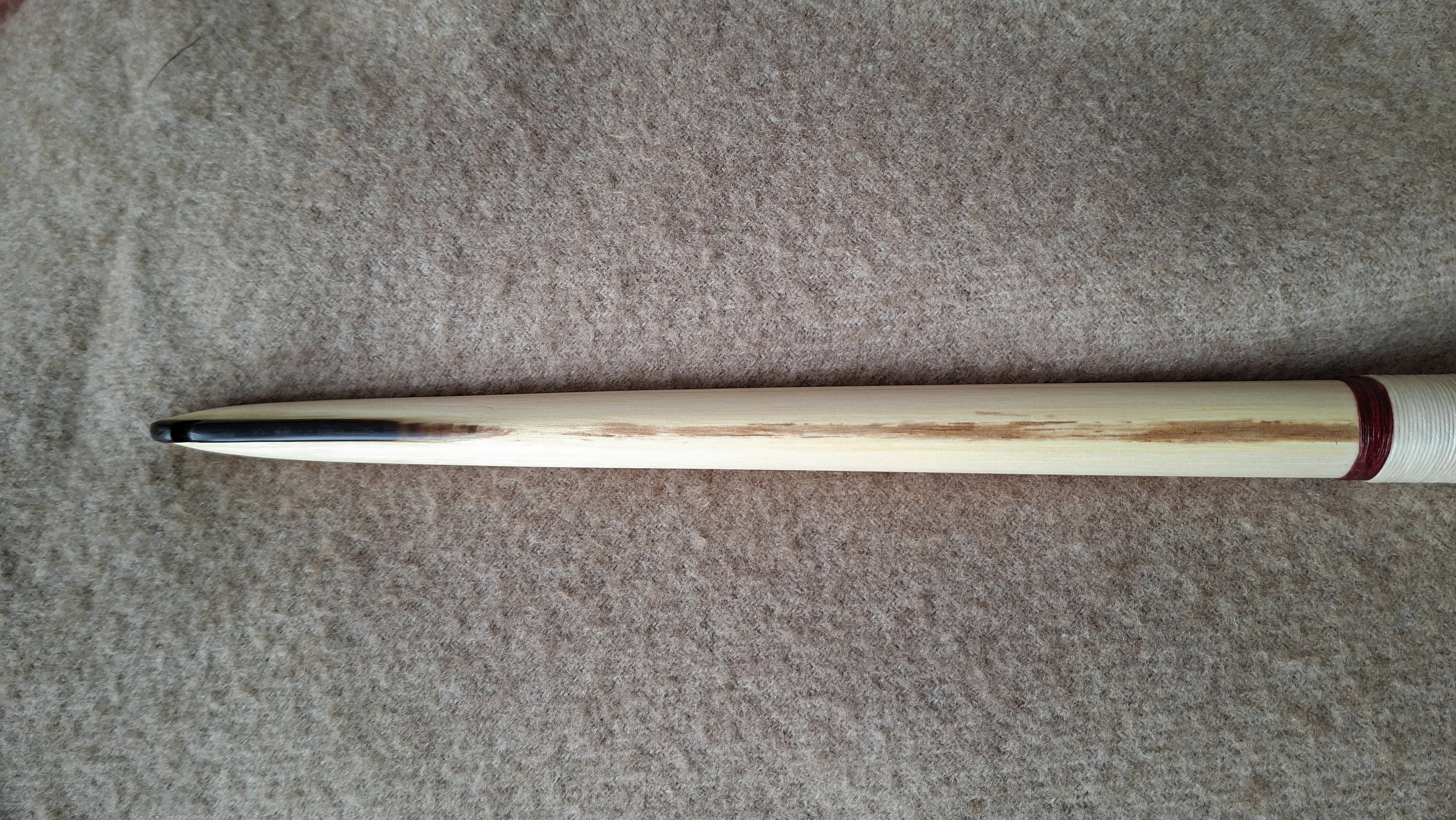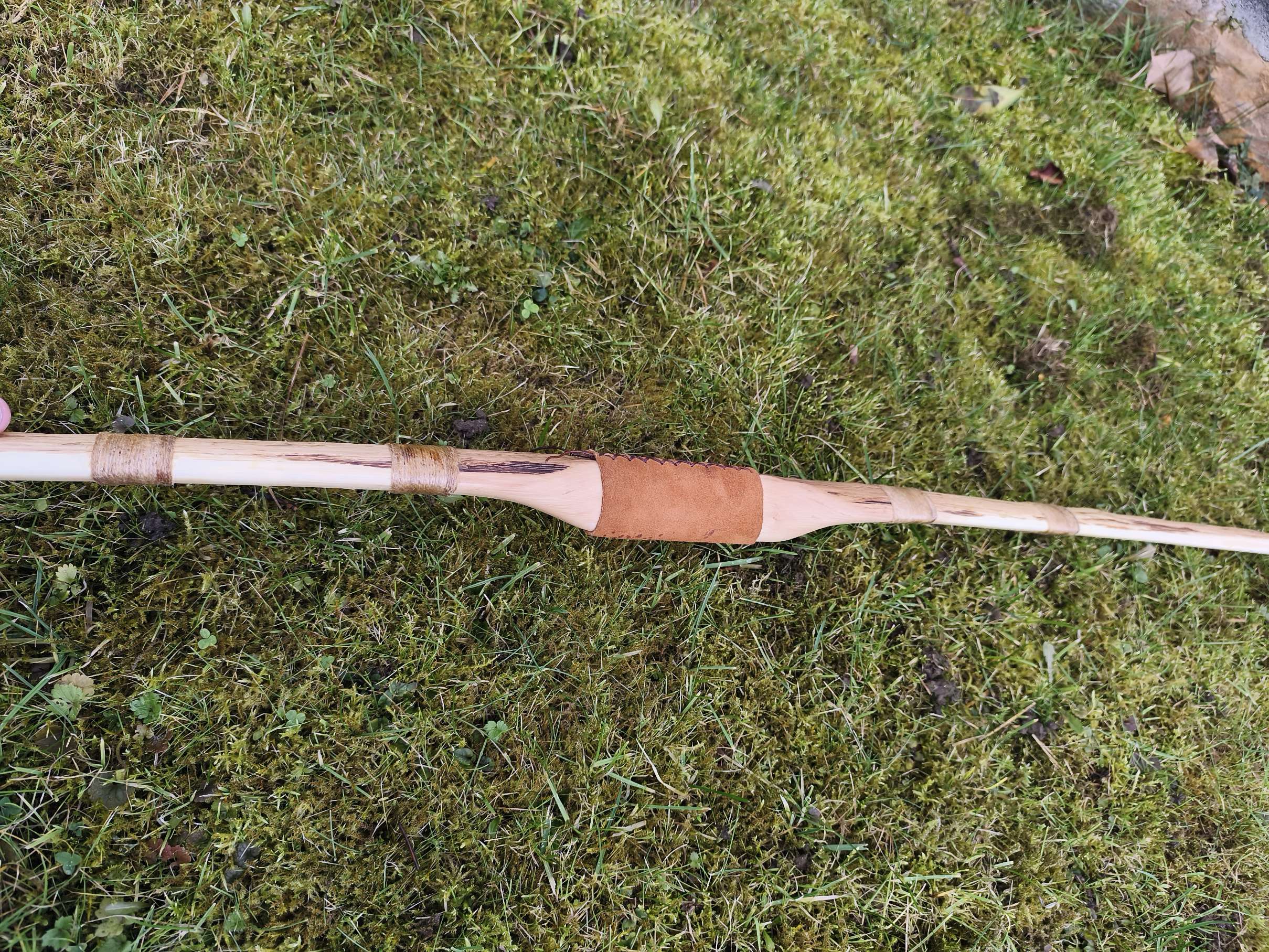 Ein sehr kurzer Stabbogen aus einem Stängel von nur 22mm Durchmesser aus einer Hartriegelhecke in meinem Garten. Die Sehnenlage hatte sich immer wieder beim Aufspannen verzogen weshalb ich ihn gekürzt habe und schließlich den Bogenbauch sehr einseitig abgetragen habe. Nun passts. Oberhalb des Griffs knitterte er heftig wegen eines quer sitzenden Astes. Deshalb war eine Reparatur nötig. Diese ist unter Nutriafell versteckt. Der Bogenbauch ist leicht geröstet.