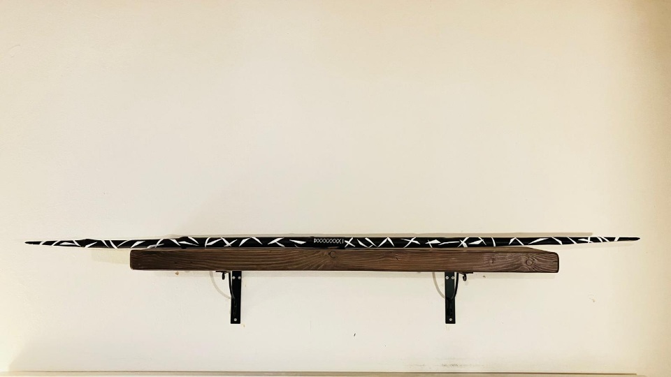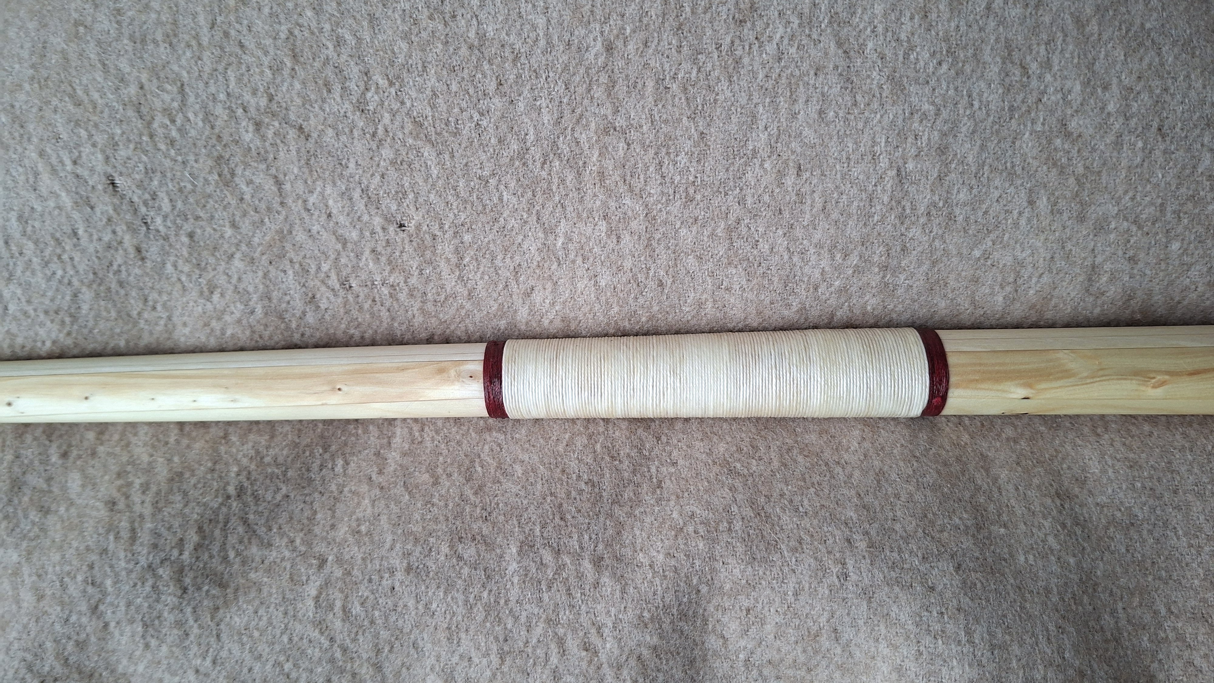 Griff: Zetschkenholzstege als Ausgleich mit Epoxy verklebt, Leinenfadenwicklung 1mm mit Epoxy getränkt, darüber Lederbandwicklung gewachst