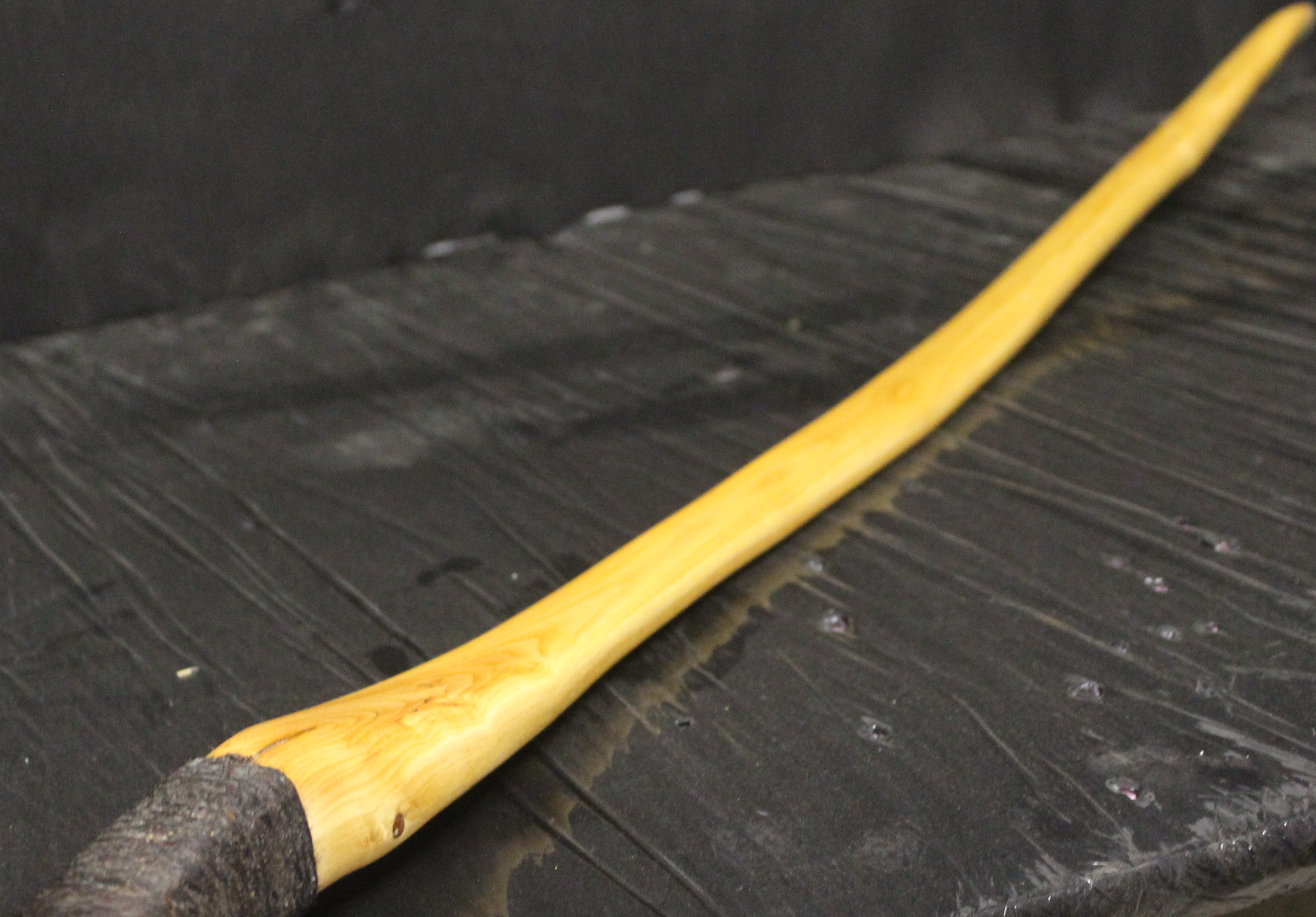 Heimische Traubenkirsche: Prunus padus, kurzes Stämmchen mit 5cm Durchmesser an der dicksten Stelle, geteilt in Längsrichtung und mit V Spleiss zusammen gesetzt, Verklebung mit Epoxy, Griffaufbau mit einem Traubenkirschenrest, aufgeklebt mit Epoxy