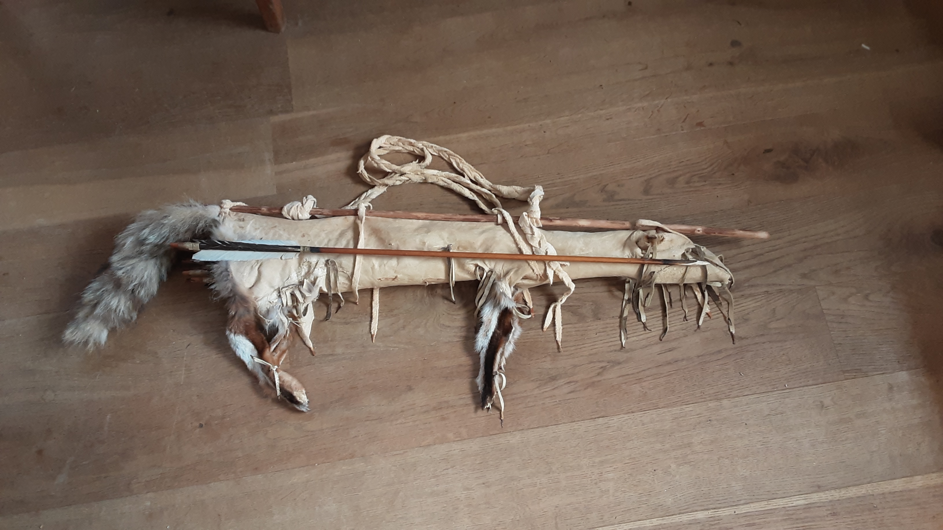 Der Balg wurde mit der Fleischseite aussen (Haarseite innen) zum Köcher. Die Pfeile und vor allem die Spitzen sind durch das Fell innen geschützt und so eingebettet, dass da nicht klappert.