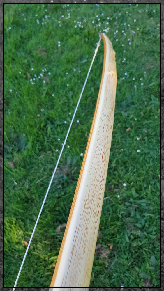 Sehr schöner Bogen mit gutem Tiller. Kann man nahezu nix korrigieren. Abgespanntes Bild fehlt aber ich glaube zu wissen, dass diese Gras/Holz Kombination sich ordentlich setzt.