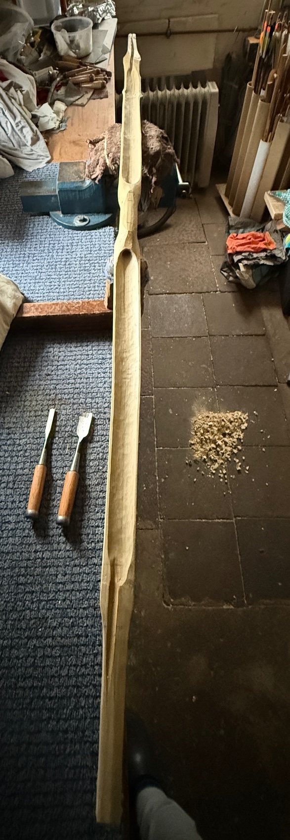 Vor lauter Schreck hab ich noch ein wenig an den Nadeln und am HLD gearbeitet. Die Rinne ist im Moment 7mm tief. Ich habe damals mit HLD angefangen, weil mir die Wurfarme zu schmal wurden, wenn ich sie dünner mache. Also habe ich im Inneren Holz abgetragen, die Breite blieb erhalten und der Bogen ...