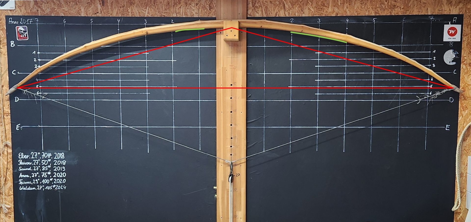 So... bei 27" hat er immer noch 110# Bei 33" sollte er so zwischen 110 und 120# sein... d.h. ich muss jetzt gleichmäßig schwächen und will dabei aber nicht über die Zielpfundzahl ziehen... Ich sehe hier noch link von Griff bis 3 eine etwas steiffe Stelle und rechts würde ich gleichmäßig schwächen. Ri ...