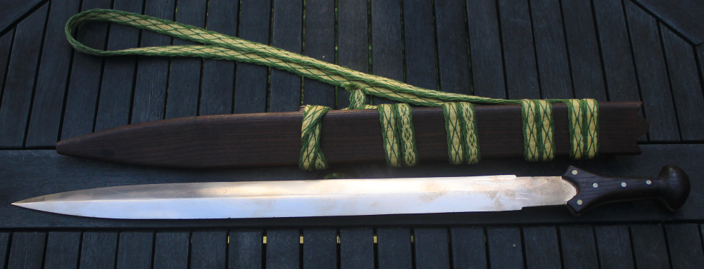 hier mal mein Bronzeschwert mit Holzscheide und Trageriemen.