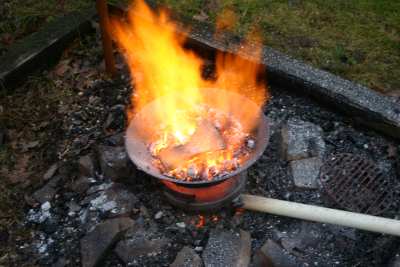 Die liefert direkt vorgewärmte Luft. Müsste das Schmiedefeuer doch noch heißer machen, oder?