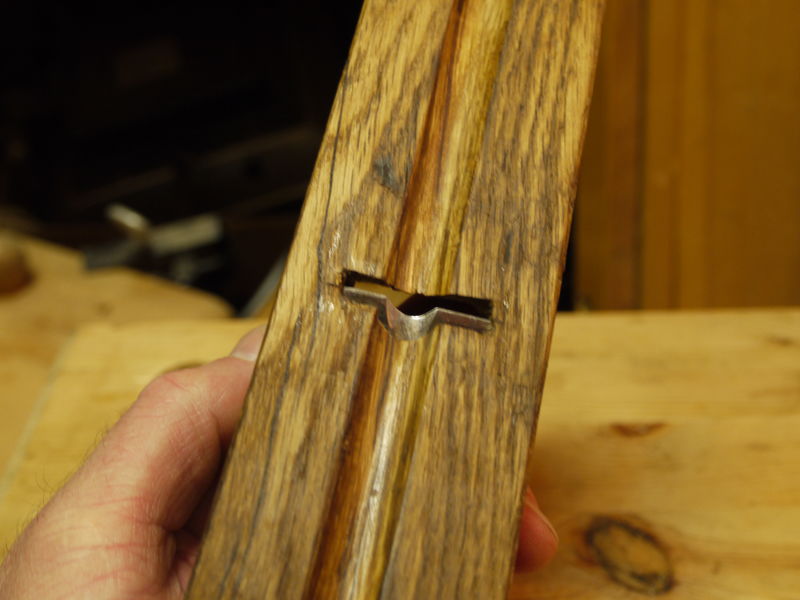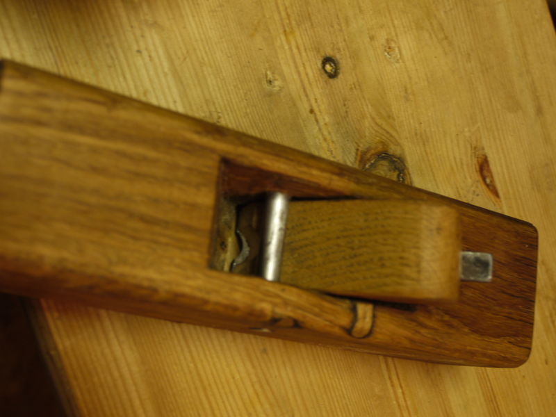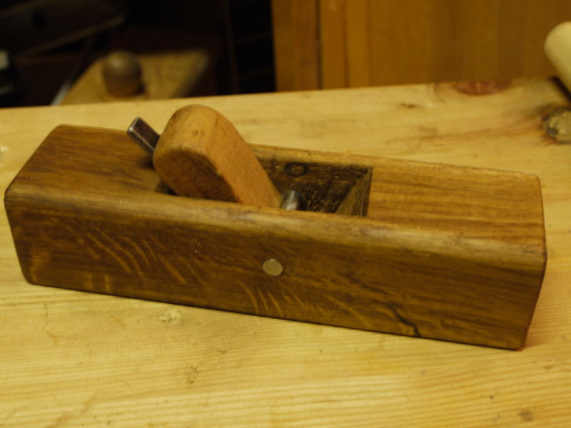 http://www.fletchers-corner.de/viewtopi ... 40#p508940 . Der funktioniert zwar recht gut, was mich an dem aber immer ein bissl gestoert hat, war dass er relativ unergonomisch ist. Nachdem ich neulich mal wieder nicht wiederstehen konnte und auf ebay einen weiteren Simshobel fuer ein paar lumpige Euro geschossen hab, hab ich mal versucht das ganze auf ein bissl anderes Niveau zu kriegen und hab aus einem Stueck Eiche, dass uebrig war und dem Hobelmesser des Ebayhobels das hier gebaut: