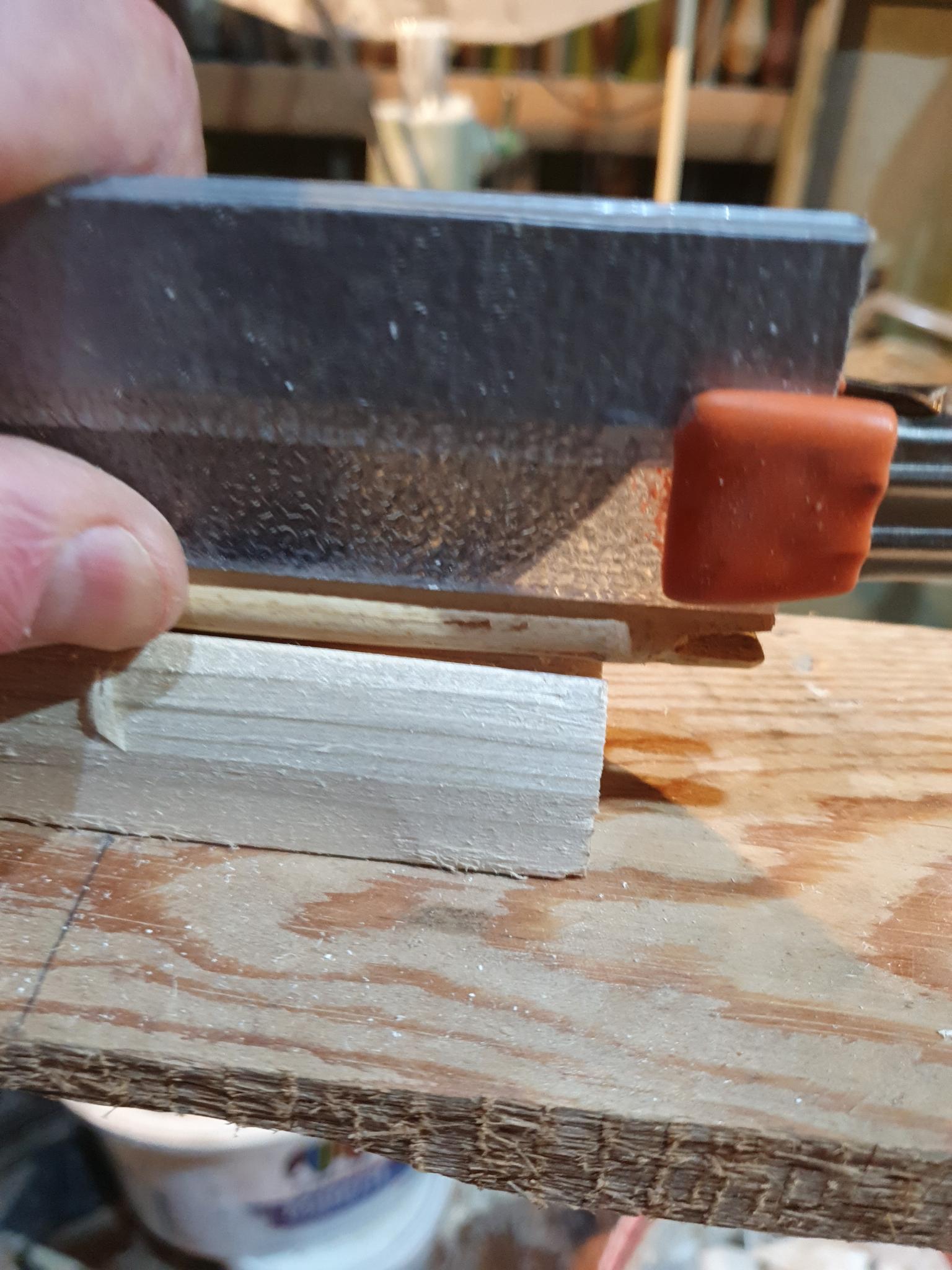 Der 60Grad-Klotz. Geteilt und mit Fahradschlauchgummi drum. Nocke waagrecht stellen Leitfeder in die Klemme stecken und mit Schleifpapierfeile (60er) den Kiel planen. Sekundenkleber drauf Aufkleben und bis 60 zaehlen, weil Sekundenkleber eigentlich Minutenkleber heissen muesste, klingt aber sch...lecht Nochmal alle Einzelteile, nebst dem Unterlegklotz fuer den Pfeil