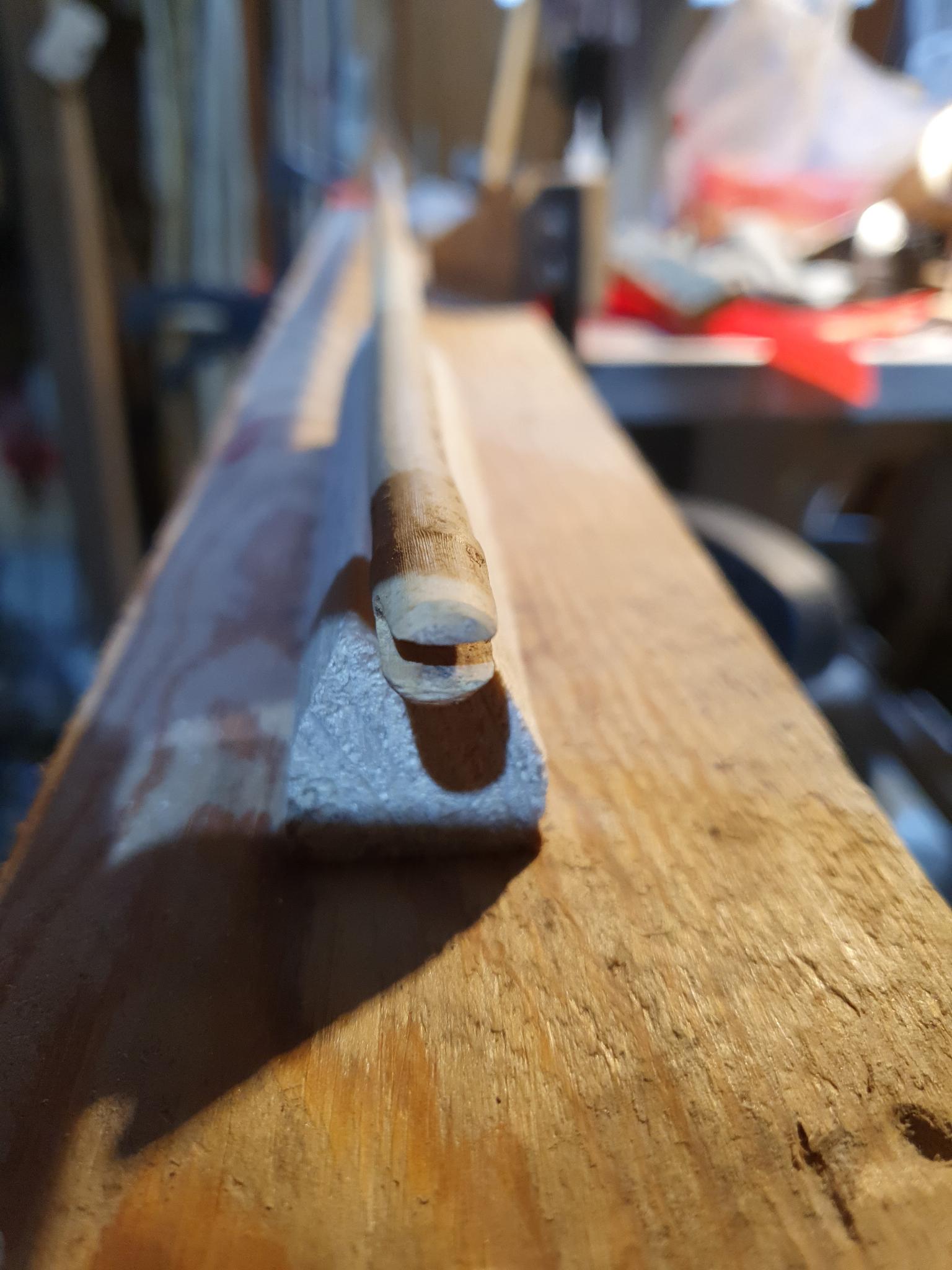 Ich hab das mit einem Draehtchen aus einem Fahrradschaltzug versucht. Das ist nicht steif. Das muss man mit anderen Draehtchen "abspannen". Die Form wird also etwas eckig. Aber das hat mich nicht so gestoert. Ich hab nur gemerkt, dass ich den Pfeil mechanisch sauber rotieren muss. Das ist fuer verschiedene Schaftdurchmesser (5/16" - 1/2") gar nicht so einfach zu realisieren. Ausserdem isses noch Trum was rumsteht.