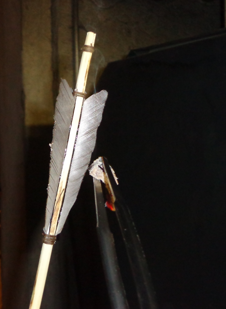 der Rosenpfeil hat einen fetten Markkanal; deshalb bekommt er Nocke und Spitze aus Knochen.