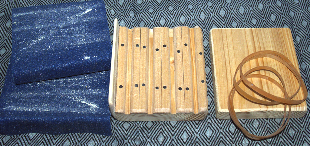 Einrichtung zum Glattschleifen (s. Foto): Dazu nehme ich 2 etwa quadratische Holzklötze mit ca. 10cm Kantenlange (D ca. 17-30mm), in einen der Klötze forme ich mehrere V-Nute (Flankenwinkel ca. 80-90°) in die der Schaft zu ca. 50% Tiefe hineinpasst. 60er Schmirgelpapier. Die beiden Klötze werden mit Gummis zusammengespannt und der Schaft im Nutbereich eingeschoben. Dann Akkuschrauber (um Schaftende Pappe oder Schlauchstück).