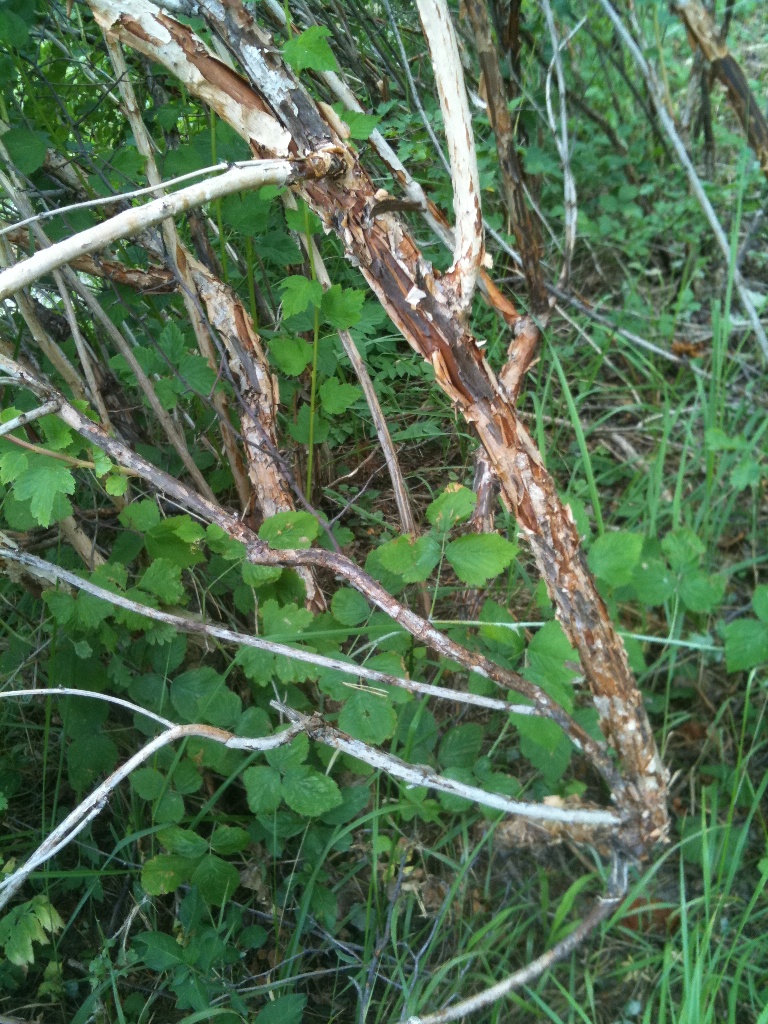 Die Rinde blättert beim getrockneten Stengel als ganz dünne Haut ab. Man sieht dies ansatzweise beim dritten Bild. Die Rinde mit ihren Eigenschaften erinnert mich an Weigelie. Die Schwere und Stabilität des Holzes entspricht dem jedoch nicht.