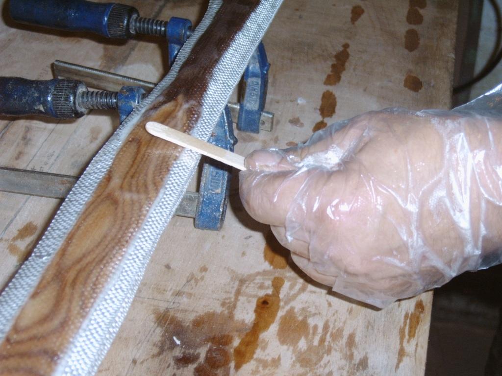 4: Mit Glasfaserband kann man auch eine unregelmäßige WA- Oberfläche (z.B. eines Selfbows, bei dem man das Zuggewicht erhöhen möchte oder der schlicht einen stabilen Bruchschutz benötigt...) mit Glas belegen...