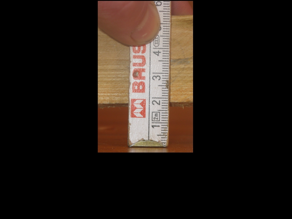Das Gewicht hat sich in den zwei Tagen um 80g verringert. Es sind nun 720g. Ich vermute, es wird nicht mehr viel an Feuchtigkeit verschwinden können. Trotzdem habe ich den Stave nochmal in seitliche Lage gezwungen und vier cm "überspannt". So werde ich ihn jetzt zwei Wochen liegen lassen:
