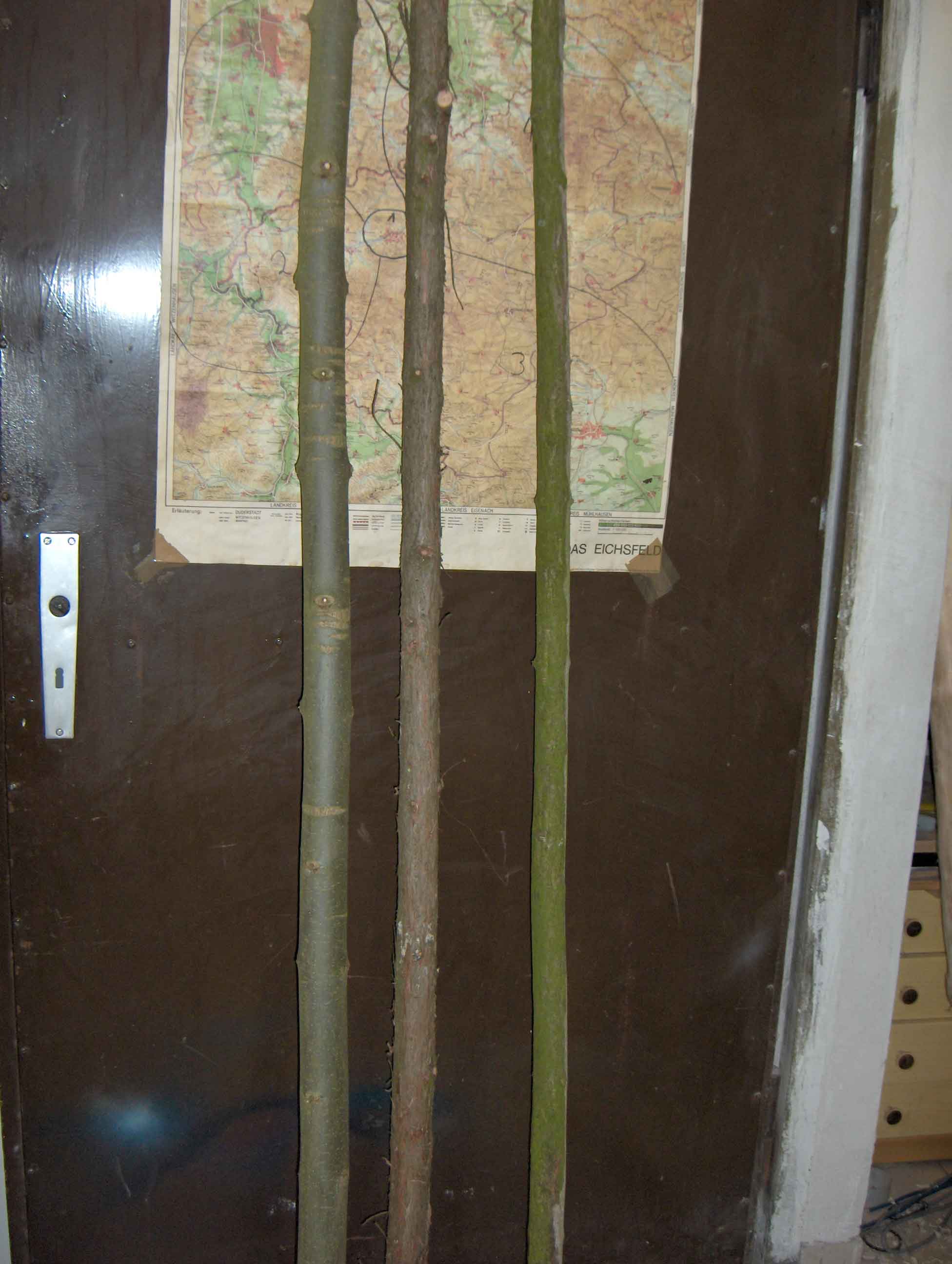Also, Gerhard, von links nach rechts: Esche, Kiefer(edit: ok, Wacholder paßt vielleicht besser), keine Ahnung. Wobei "keine Ahnung" ein Laubbaum und damit wahrscheinlich bogentauglich ist. Sieht jedenfalls nicht nach den häufigsten Nullnummern wie Pappel, Weide und Konsorten aus.