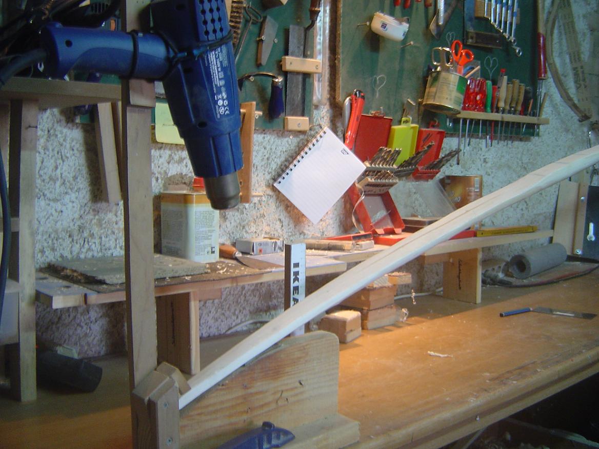 Ich hab s jetzt einfach mal probiert.Biegen ging soweit ganz gut. Gestern hab ich das Eine, heute das andere Ende gebogen. Ich laß den jetzt noch über Nacht auf fixiert. Morgen wird der Bogen dann auf einen Balken gespannt und dann gehts mit der Trockenphase und der Warterei los.