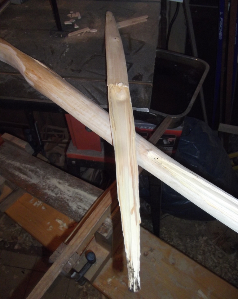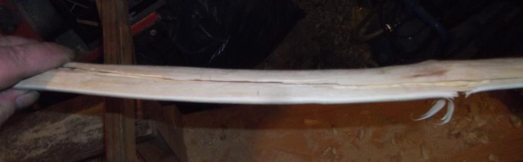 HUCH wie kann denn sowas? Für mich sieht das nach einem Holzfehler, oder nach versehentlich verletztem Rücken aus. Zu trocken war das Holz aber wohl nicht. Der sehr stark faserige, splitterige Bruch zeigt, das das Holz elastisch und zäh war.
