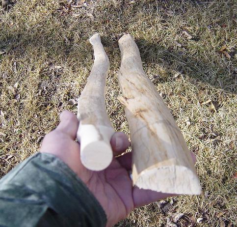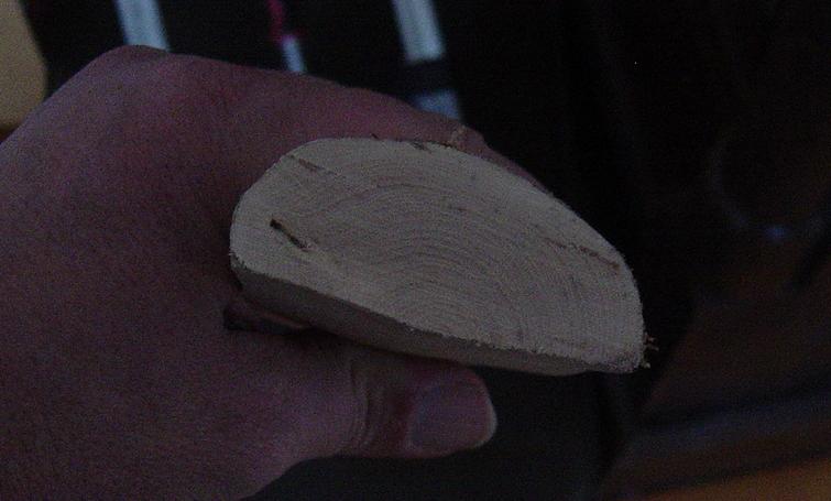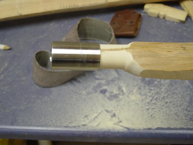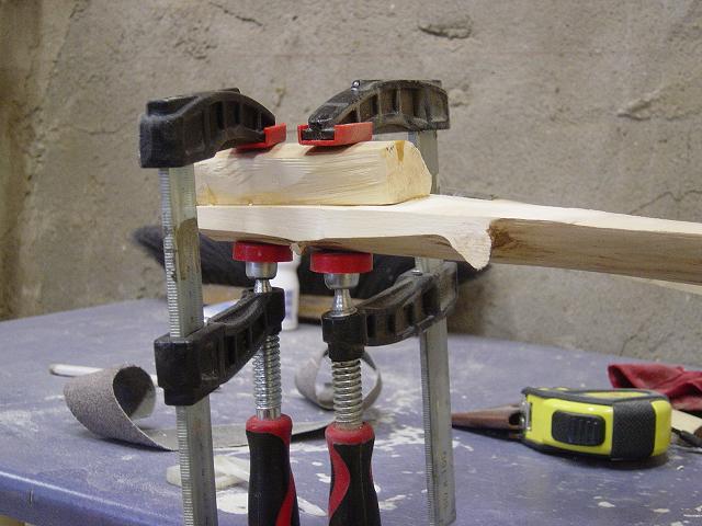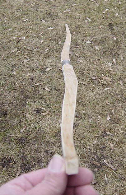 Am nächsten Tag auch dieses Ende runden und auf die Hülse auf beide Enden aufkleben, wieder mit 2K. Wenn alles fest ist, die Hülsen zusammenstecken, zurecht drehen, und genau den Bogen anzeichnen. An den Seiten überschüssiges Holz mit Beil, Messer und Zughobel abtragen und glätten.