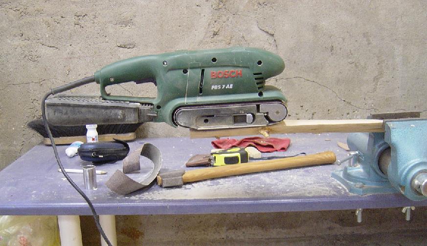 Werkzeuge E-Bandschleifer, Beil, Messer, Bindfaden, Bleistift, Schraubstock, Schnitzbank, 2K-Klebstoff, Sandpapier, Schmirgelleinen, Schraubzwingen, Heisluftpistole.