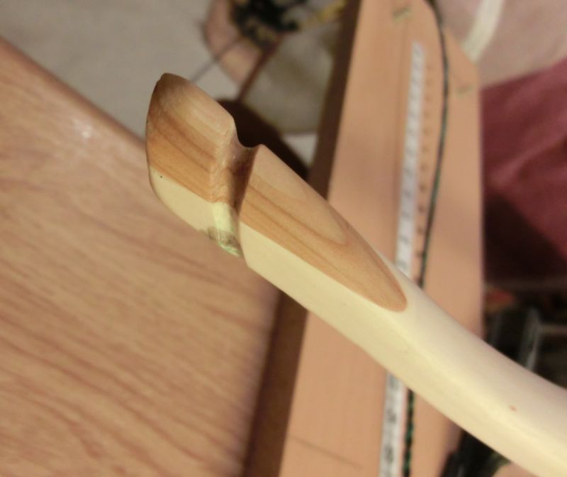 Den falschen Sehenenverlauf konnte ich etwas verbessern, ich hab die Wurfarme ca. 1h gedämpft und dann seitlich eingespannt, so richtig weich war das Holz aber nicht.