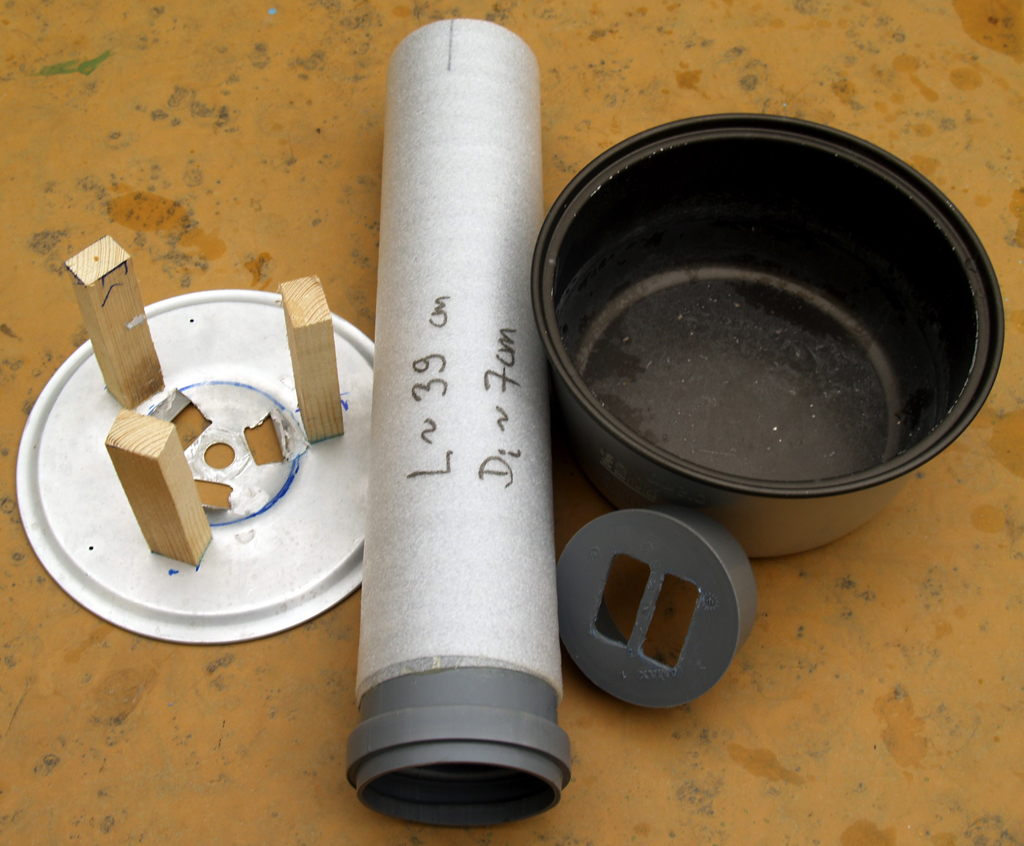 --Bambus-Latten 10min in kochendem Wasser erhitzen, dann über glühender Herdplatte kurz erhitzen und sofort mit R=15cm biegen (Vorrichtung muss ich mir noch ausdenken, wg. Nodien-Erhebungen), ohne Stahlband. Trocknen lassen.