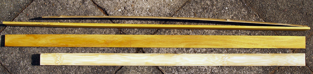 --Bambus-Latten: momentan 33-34mm breit, linsenförmiger Querschnitt und an Längskante spitz auslaufend, Dicke am Mittenstück 3-4mm und am Ende 2,5mm, gleiche Länge wie Osage-Latte. Bei der Bambuslatte muss die Dicke noch etwas ausgeglichen werden (Zieheisen).