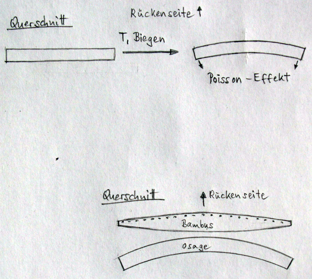--Das Verhältnis von Bambusdicke zu Osagedicke ist etwas viel zugunsten des Bambus, eine weitere Ausdünnung des Bambus hätte die Bambuslatte schwer handelbar und am Rande ausgefranst gemacht. Sie hätte dann schmäler werden sollen, so wie Hieronymus das vorgeschlagen hatte. Andere lassen die Bambusschicht bis zum Rand laufen, da ist vielleicht Osage dicker oder der Radius des Bambusstamms deutlich größer und somit der Querschnitt mittig nicht so dick.